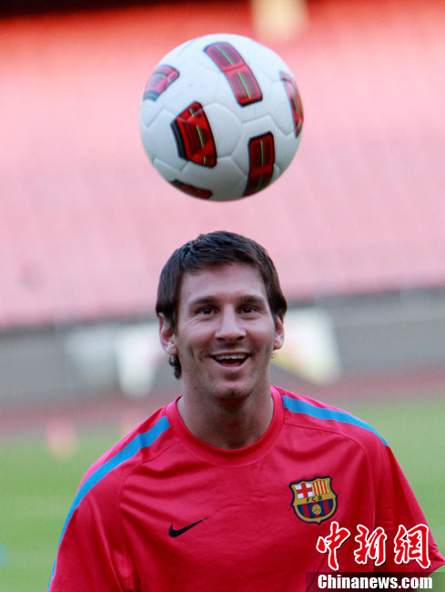 8月6日,巴塞羅那俱樂部在北京工人體育館進行了第二次公開訓練課,眾多巴薩球迷也在現場目睹了球隊風采。圖為梅西出場表情輕松。中新社發 杜洋 攝