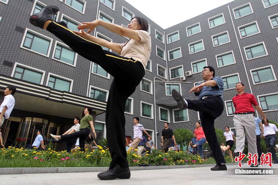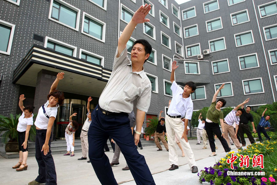 8月9日,北京化工集團(tuán)的職工在工間時(shí)段集體做廣播體操。當(dāng)日,北京恢復(fù)廣播體操,電臺(tái)在每天10時(shí)和15時(shí)連續(xù)播放兩次第八套廣播體操音樂,時(shí)長為8分鐘左右。此次,北京市總工會(huì)定下目標(biāo),2011年全市職工參與健身活動(dòng)比例要達(dá)到60%以上,國有企業(yè)參與工間或工前操活動(dòng)要達(dá)到100%,機(jī)關(guān)事業(yè)單位要達(dá)到70%。中新社發(fā) 富田 攝