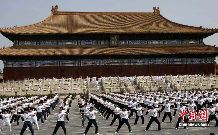 8月10日,北京50余個基層單位和表演團體的近3000余名職工工間操小教員在北京市勞動人民文化宮太廟前與副市長、體育明星和勞模們一起做“第八套廣播體操”。當日,2010首都職工示范推廣工間操宣傳周啟動。中新社發 蘇丹 攝