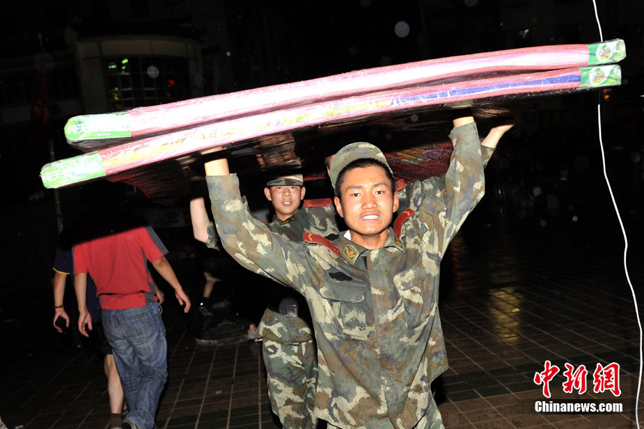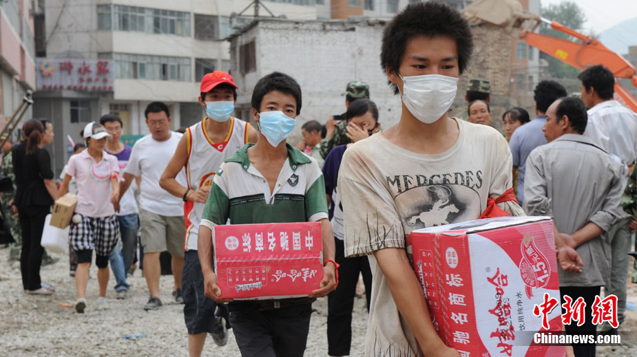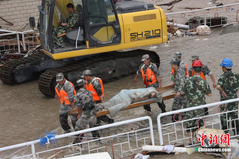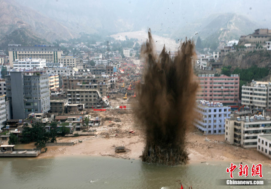 8月11日上午9時40分,蘭州軍區某集團軍“開山斧工兵團”對舟曲堰塞湖堰塞體成功實施第12次爆破。爆破后河道明顯出現斜坡,江水下泄速度明顯加快。圖為堰塞體12次爆破現場。中新社發 劉忠俊 攝