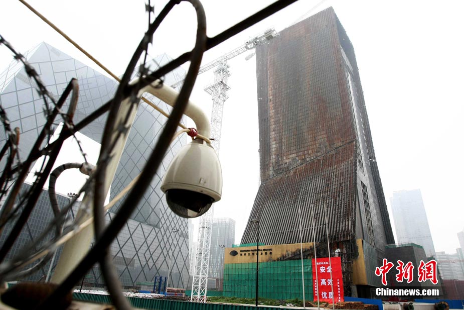 8月11日,中央電視臺電視文化中心工程(北配樓)拆卸復建施工正式啟動。據了解,當日啟動的是金屬幕墻和網架的拆卸。由于主題結構未受到嚴重影響,因此復建后的大樓將基本保持“原樣”。這標志著2009年2月9日中央電視臺大火一年多后,央視新址北配樓終于正式進入拆卸復建階段。中新社發 富田 攝