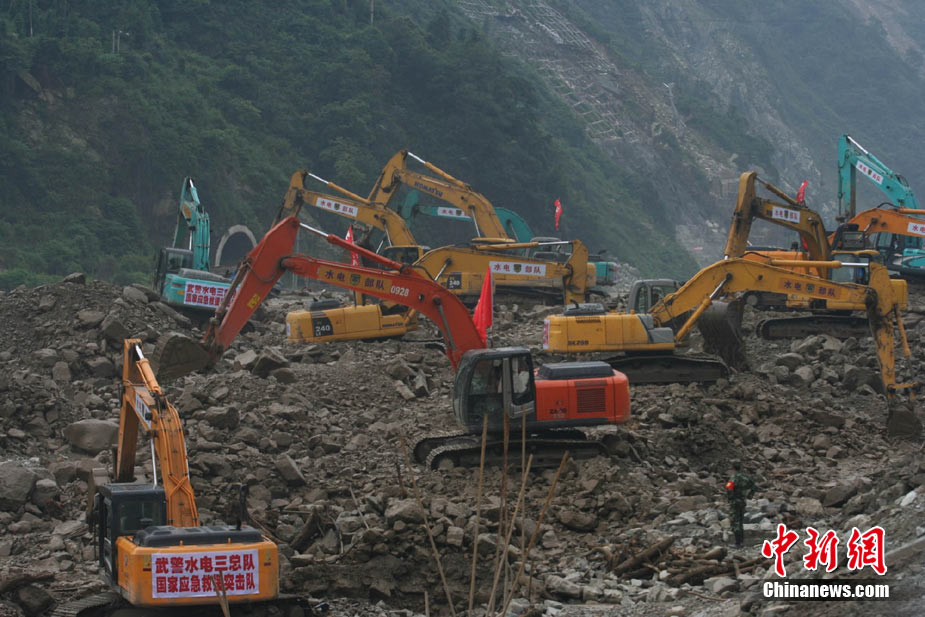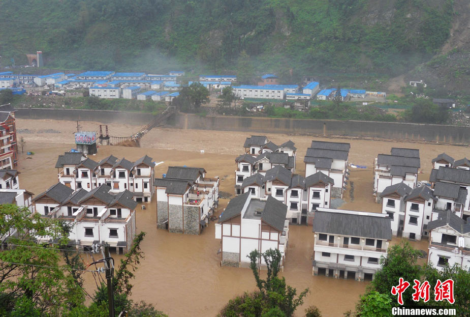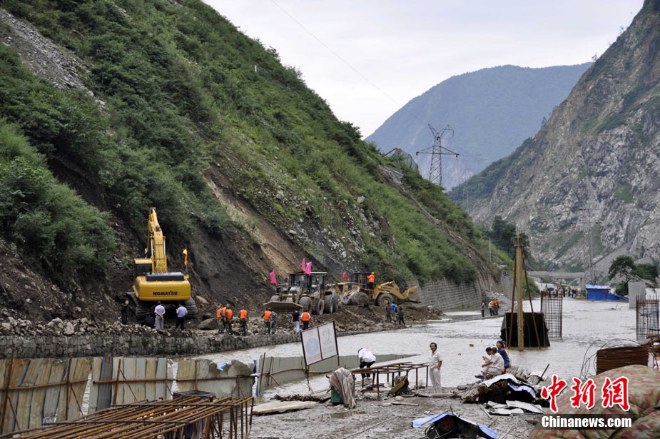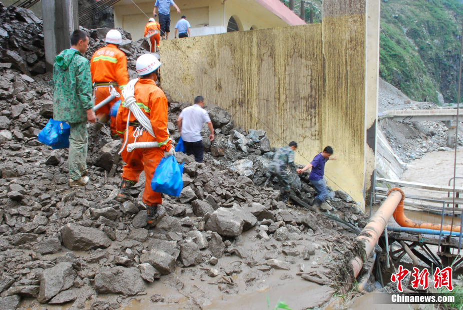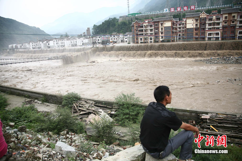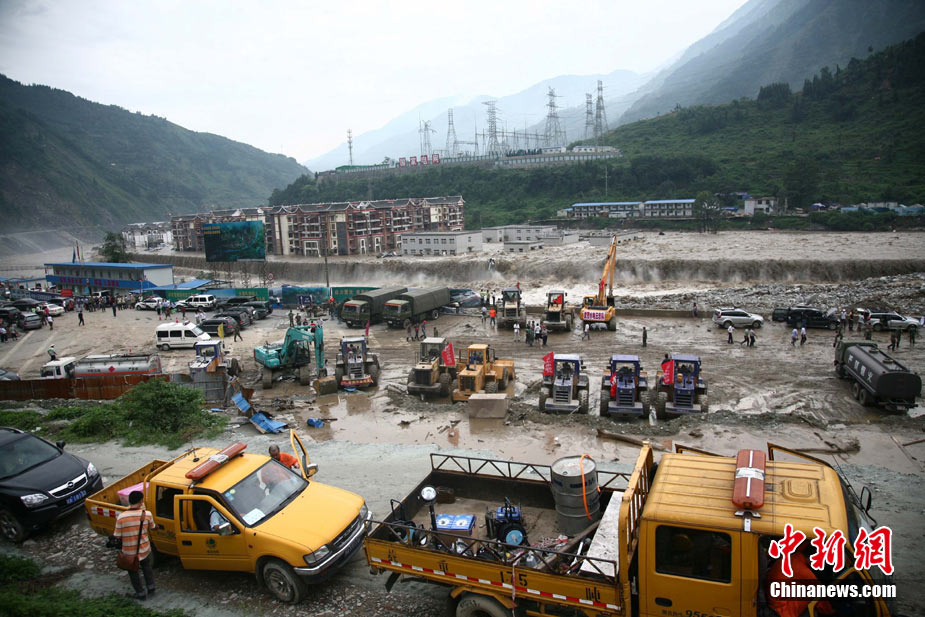 8月14日凌晨,連續(xù)強(qiáng)降雨引發(fā)汶川境內(nèi)映秀鎮(zhèn)、漩口鎮(zhèn)、銀杏鄉(xiāng)、三江鄉(xiāng)等鄉(xiāng)鎮(zhèn)發(fā)生多處泥石流災(zāi)害。其中銀杏鄉(xiāng)境內(nèi)泥石流塌方量高達(dá)6萬立方米,流經(jīng)該鄉(xiāng)的岷江也因泥石流阻斷,正在形成堰塞湖;映秀鎮(zhèn)板房醫(yī)院被泥石流沖毀。中新社發(fā) 薛升玉 攝