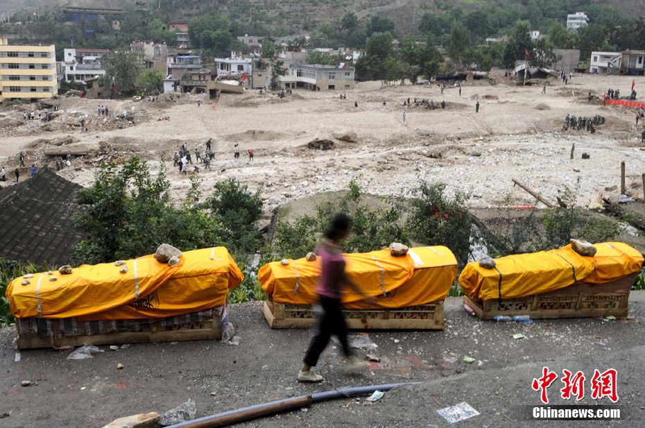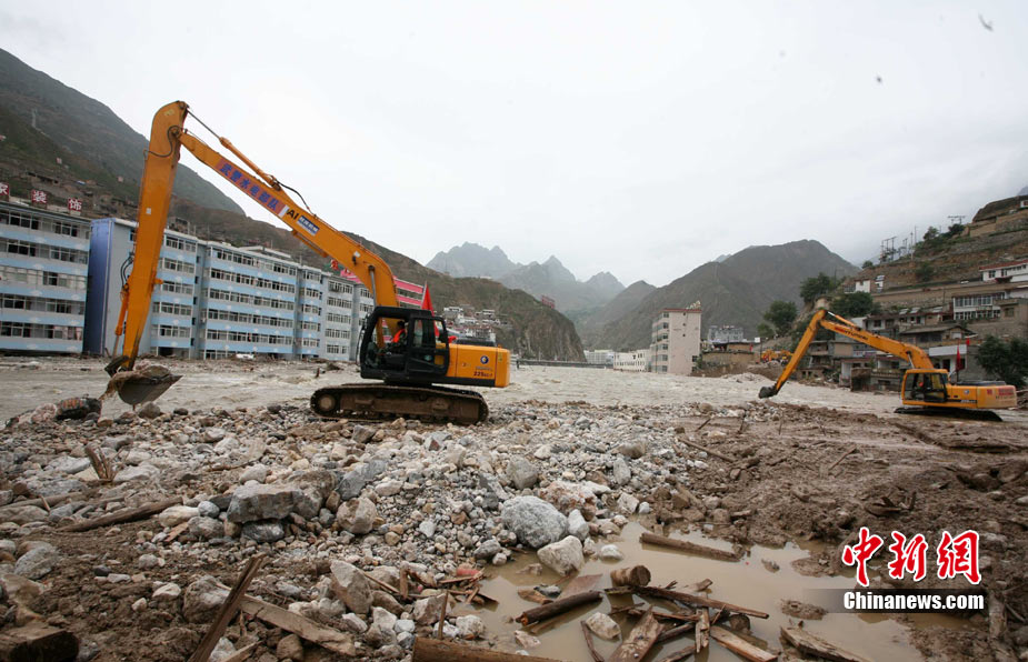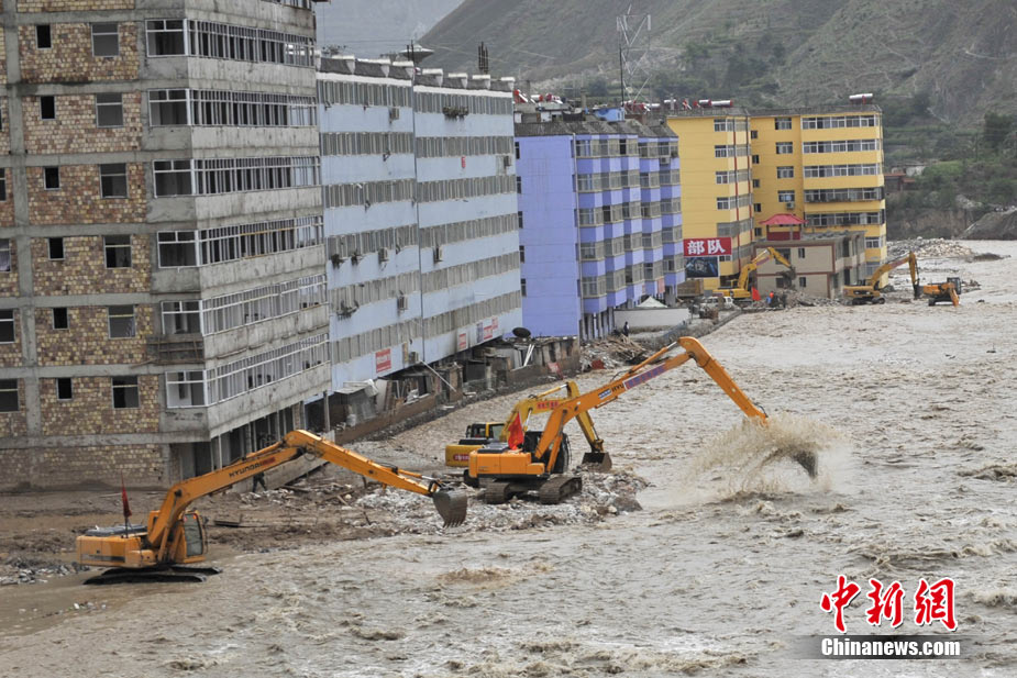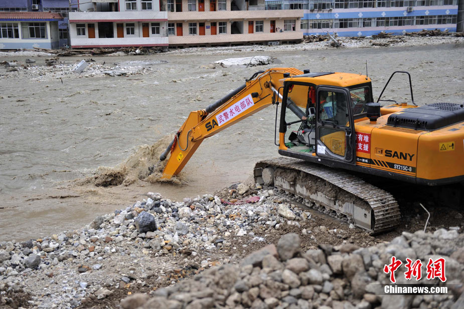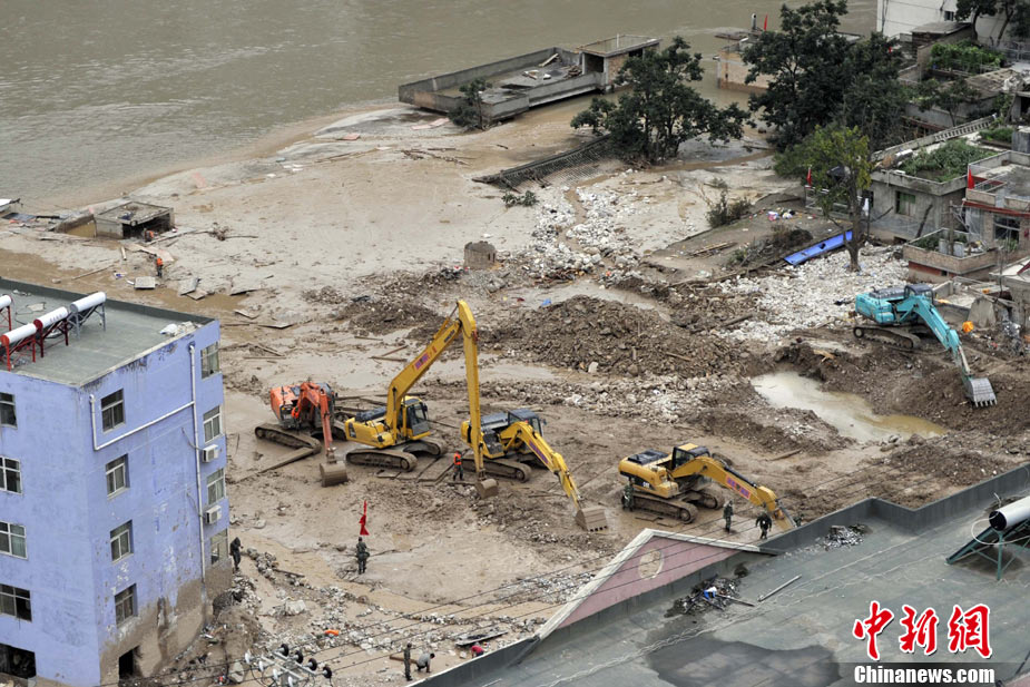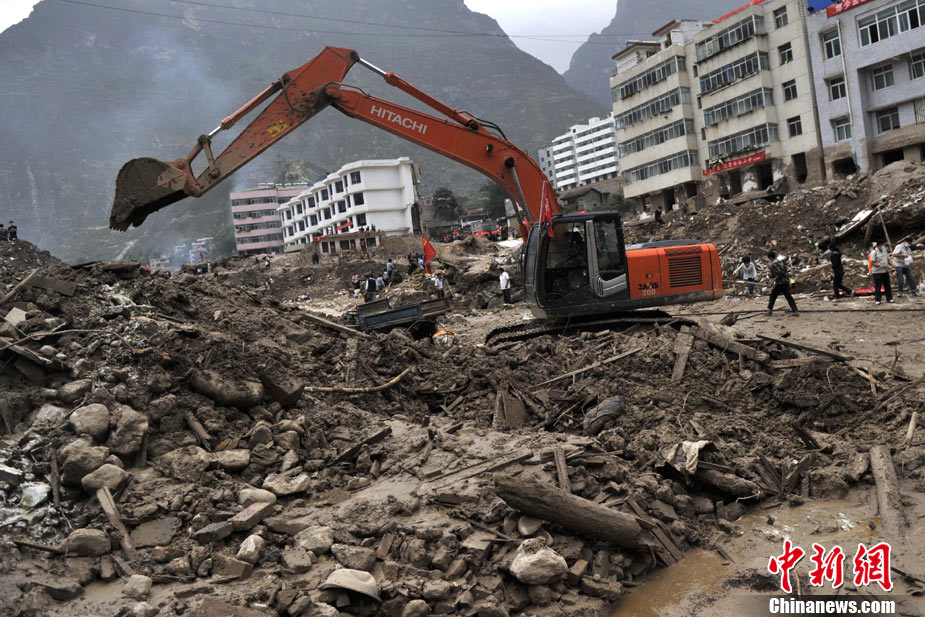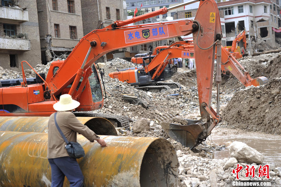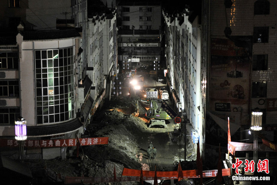 8月14日,舟曲災區救援官兵晝夜展開清淤工作。截至當日,影響大型機械進入舟曲重災區的部分街道已經暢通。蘭州軍區某集團軍工兵團從13日晚上9點到14日上午9點,出動80人、3臺挖掘機、4臺裝載機、21臺裝卸車,在舟曲縣城南街清理廢墟。經過一晚奮戰,清理淤泥200立方米,街道已基本暢通。中新網記者 金碩 攝