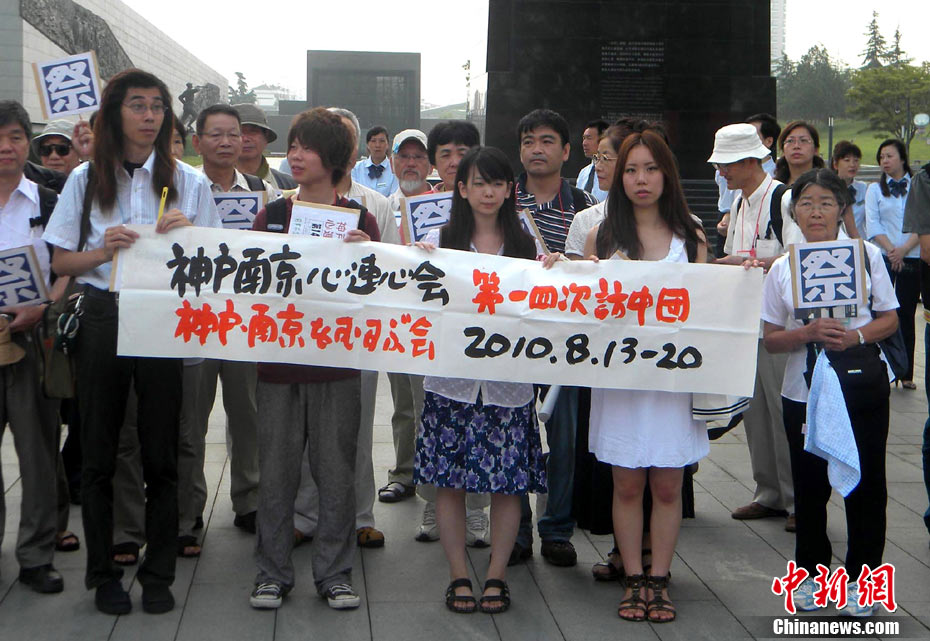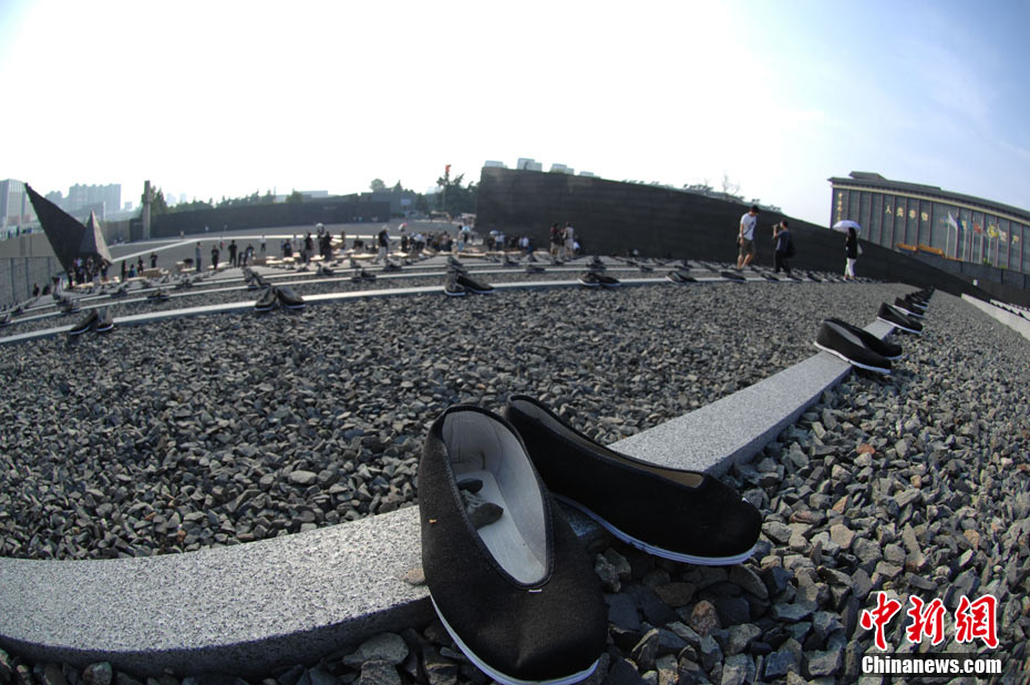 為紀念二戰期間在日本遇害的6830名被強擄的中國勞工,8月14日下午,在侵華日軍南京大屠殺遇難同胞紀念館廣場,被擄勞工中的幸存者及遇難者家屬、日本友人等近50人舉行了6830雙布鞋擺放活動。中新社發 江法 攝 圖片來源:cnsphoto