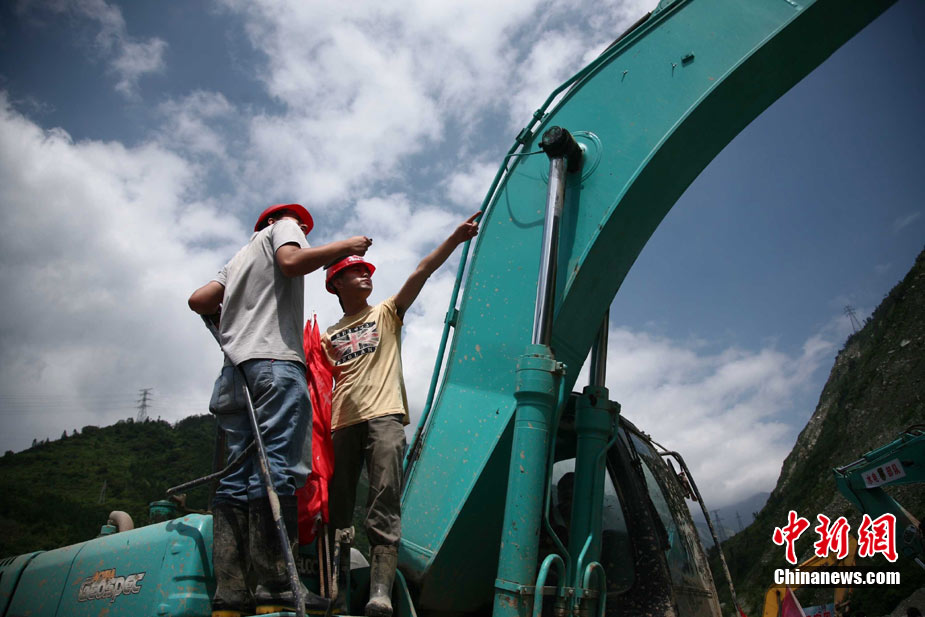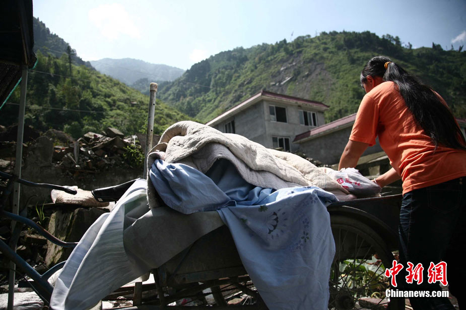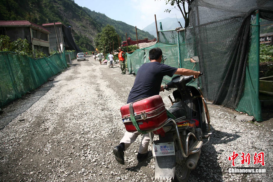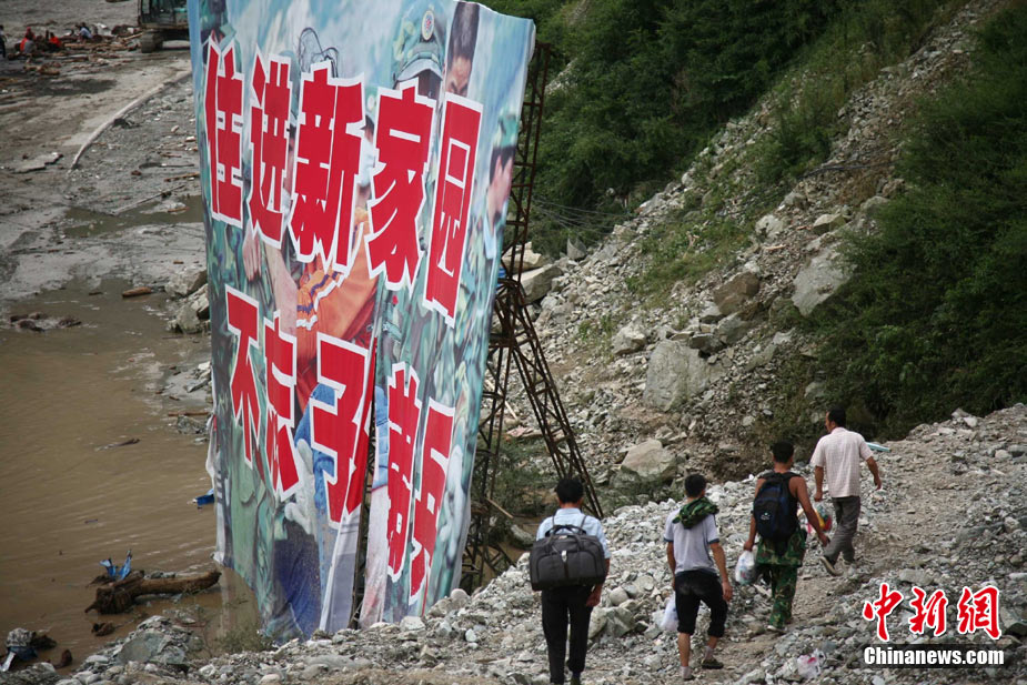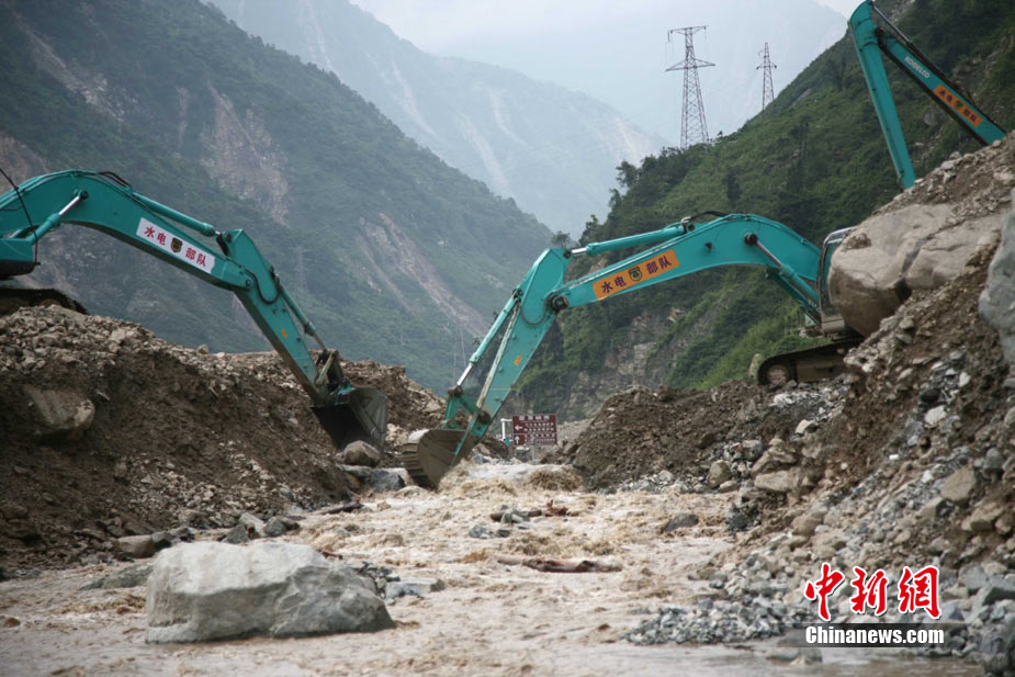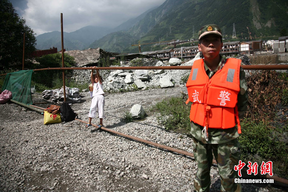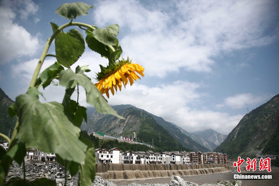 阿壩州汶川境內因近日強降雨而引發的泥石流阻斷道路、沖毀房屋,泥石流沖出物致使120米寬的岷江河道淤塞,堰塞體平均高度達7米,致使岷江改道。災后重建的映秀新城亦被洪水圍困再次成為“孤島”。8月15日,映秀天空放晴,但堰塞體還未得到根本疏通,映秀新城仍被淹水中,現場搶險指揮人員表示,堰塞體有望15日下午得到疏通。圖為映秀鎮岷江河床上一朵快枯萎的向日葵,背后則是被水淹的重建新房。 中新社發 張浪 攝