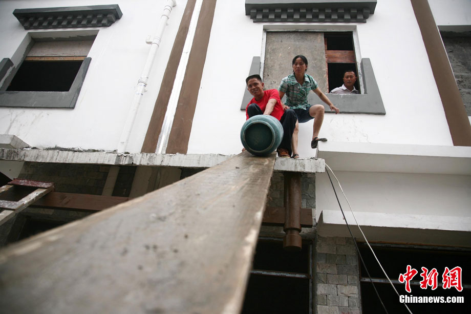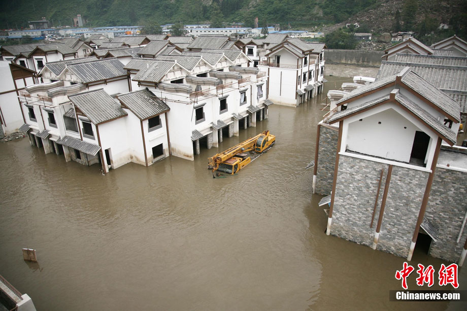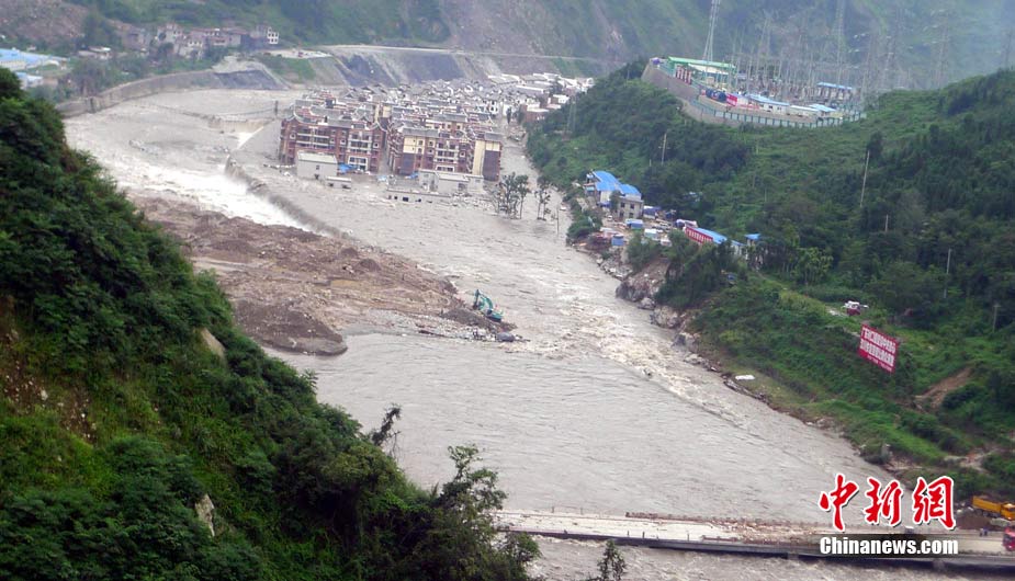 8月16日,發生泥石流災害已經兩天的四川省汶川縣映秀鎮新城,洪水水位略有下降,搶險人員還正全力自處置堰塞體。圖為被洪水圍困的映秀新城。中新社發 張浪 攝