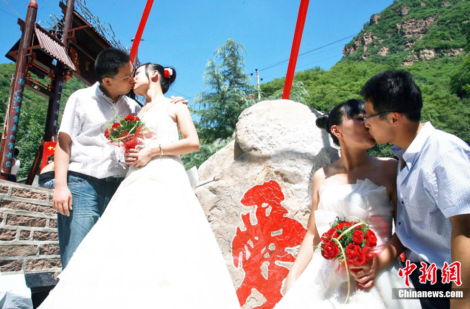 8月16日,吉林市前二道鄉“災區新娘”劉旭穎在藍色的救災帳篷里出嫁。27歲的劉旭穎本應在7月30日結婚,然而7月28日凌晨的一場罕見洪水將她家所在的村莊變成一片廢墟,也沖走了準新娘的婚禮。為了圓自己一個心愿,也為了讓災區人看到生活的希望,劉旭穎決定辦一場特別的災區婚禮。中新社發 蒼雁 攝