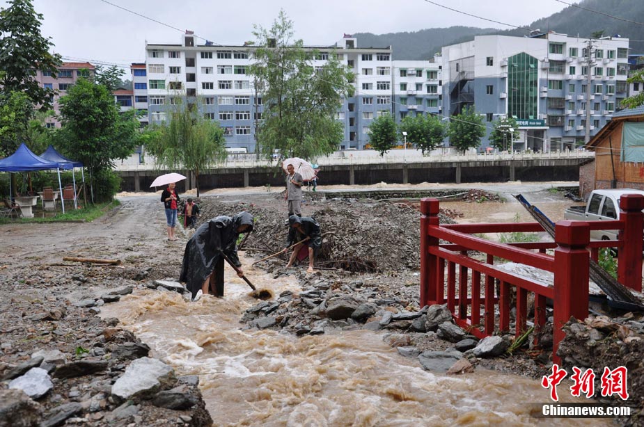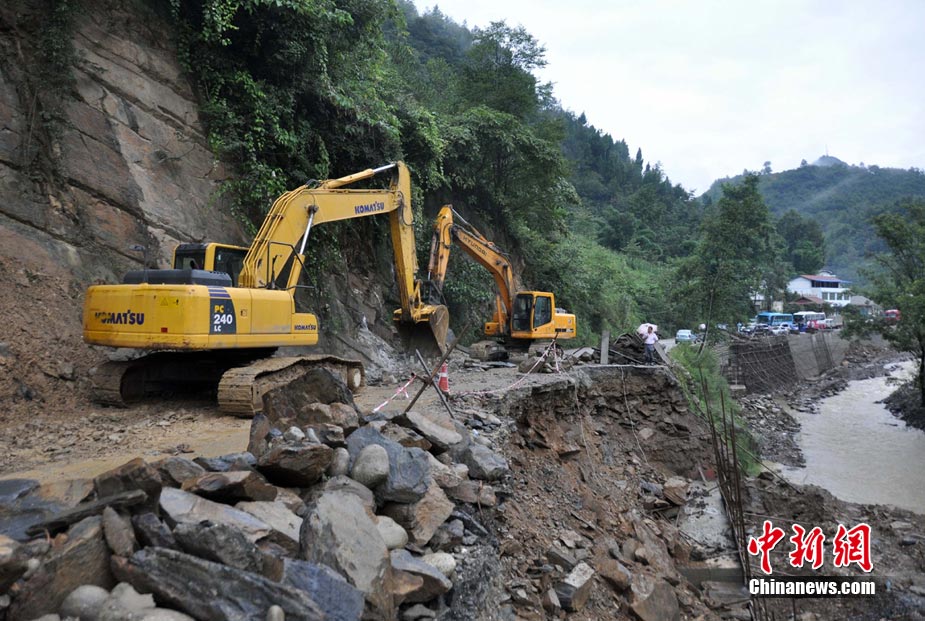 8月18日16時,四川省青川縣城前往蒿溪鄉的道路由于暴雨造成塌方,導致道路中斷,車輛通行受阻。現場由于再次出現大量山體垮塌,部分路段搶險工作被迫停止。中新社發 劉忠俊 攝