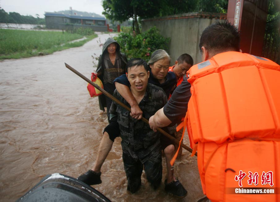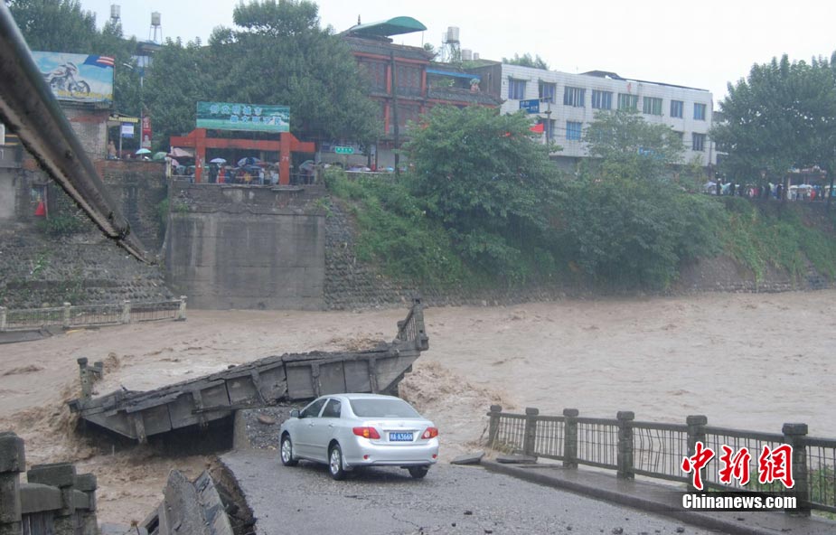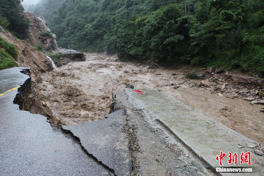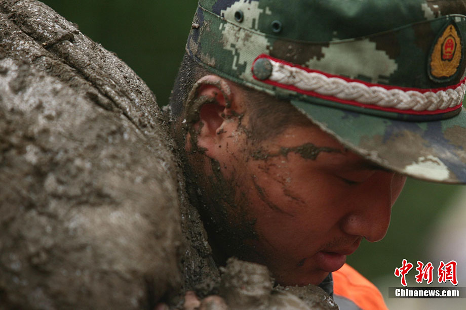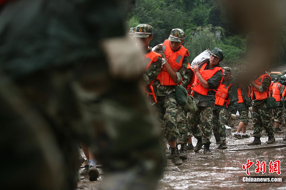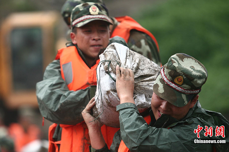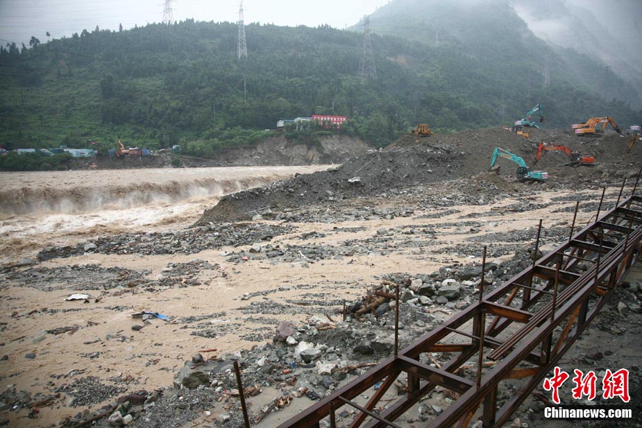 8月19日凌晨,汶川地震震中映秀再遭暴雨襲擊,引發新的泥石流災害,導致堰塞湖左岸泄洪槽被堵塞,上漲的岷江河水威脅新筑子堰。圖為搶險人員正在搶挖被堵塞的泄洪槽,旁邊則是滾滾岷江。中新社發 張浪 攝
