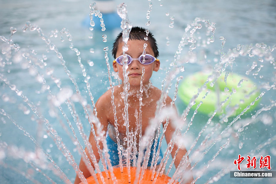 8月19日,重慶再發高溫橙色預警,預計23日以前該市將連晴高溫。為尋涼爽,一小孩趴在噴水孔附近感受水噴全身的清涼。劉函冉 攝