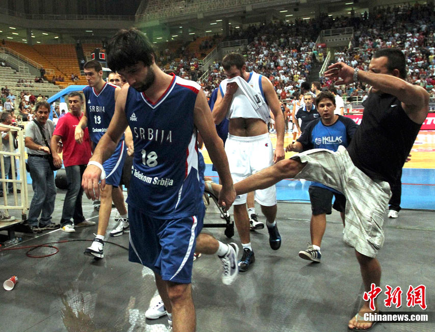 8月19日,在希臘舉行的雅典衛城籃球四國賽中,塞爾維亞隊與希臘隊爆發沖突,裁判提前宣布比賽結束。圖為塞爾維亞隊球員克爾斯蒂奇(左)將椅子扔向希臘隊球員布魯西斯。