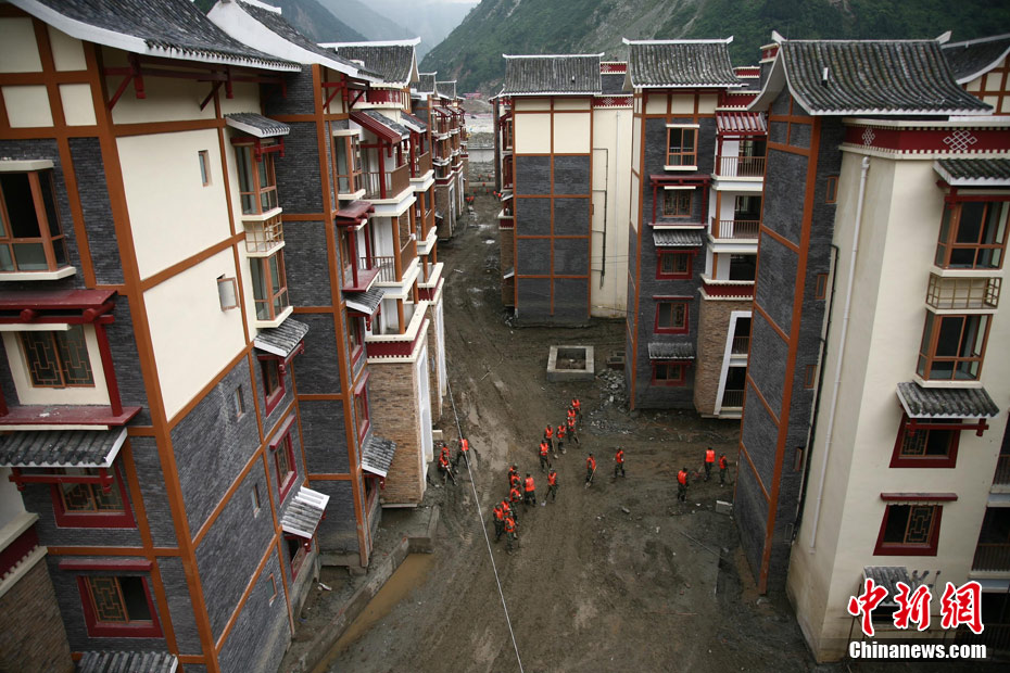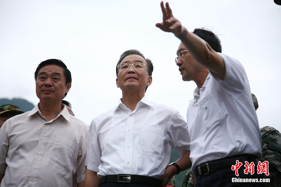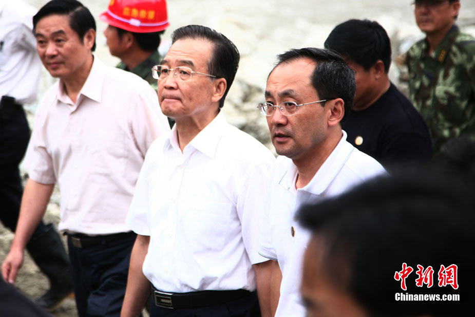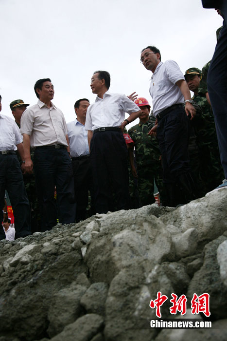 8月23日下午,中國國務院總理溫家寶抵達四川汶川泥石流重災區映秀鎮指導搶險工作,并慰問了參加此次搶險的武警官兵。溫家寶總理于22日中午臨時決定,改變從舟曲返京日程,直飛四川綿陽,指導當地抗洪救災工作。圖為溫家寶在映秀鎮泥石流現場慰問四川消防官兵。中新社發 張浪 攝