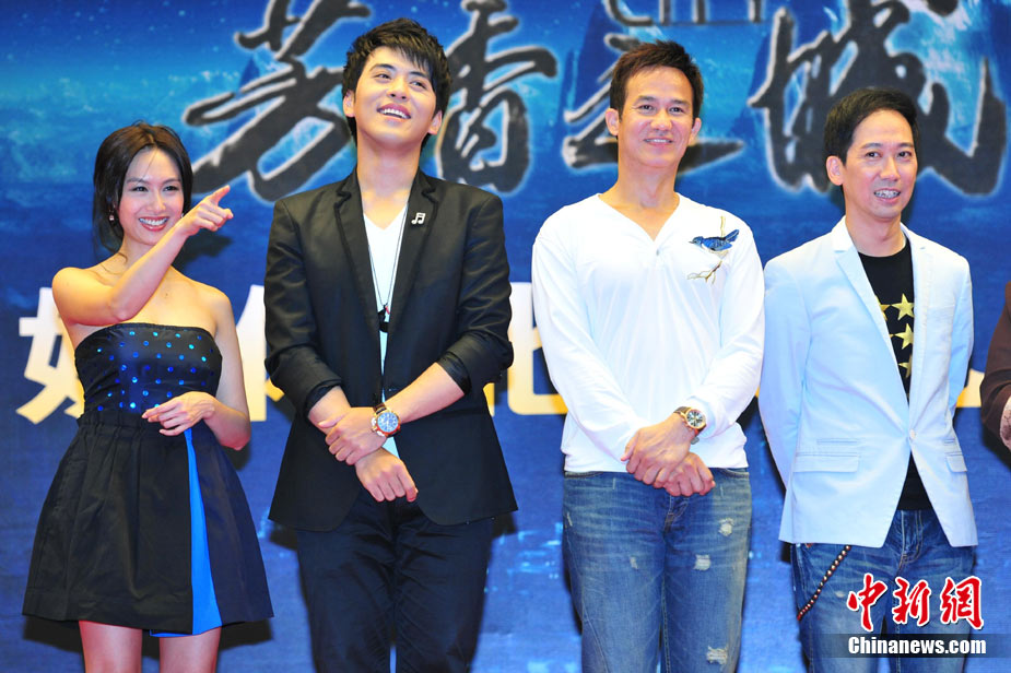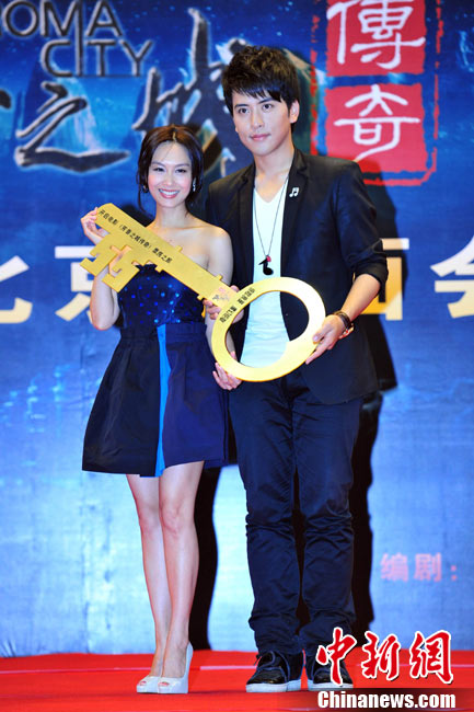 8月25日,電影《芳香之城傳奇》在北京舉行記者會。不老的“紫霞仙子”朱茵攜主演扎西頓珠、張達明、李子雄、張璇、董立范等亮相。朱茵以一襲抹胸短裙亮相,自曝在新片中大轉(zhuǎn)型,飾演一個有天然體香的神秘啞女,男主角扎西頓珠飾演的“富二代”被其吸引后,上演了一段純美姐弟戀。朱茵在接受采訪時坦言自己并不拒絕姐弟戀。圖為朱茵、扎西頓珠現(xiàn)場秀親昵。中新社記者 李學(xué)仕 攝