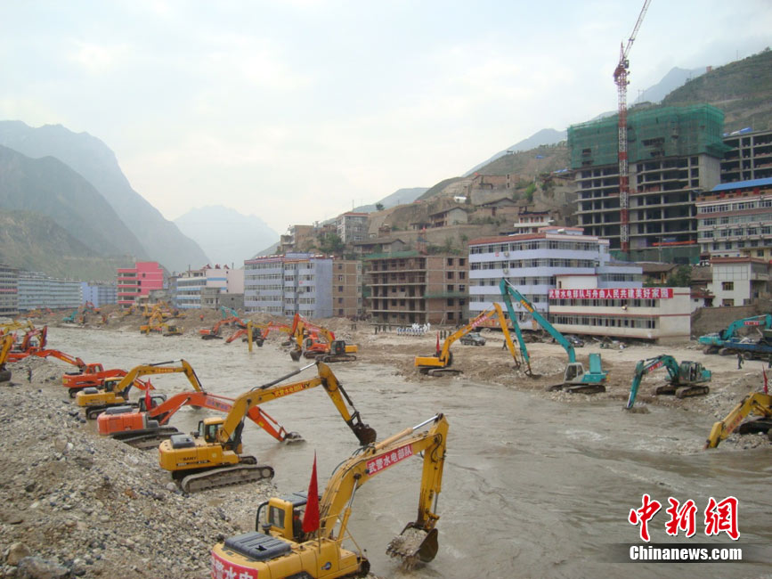 8月30日,舟曲白龍江堰塞湖應急排險和河道應急疏通任務,比預定時間提前12小時全面完成。這是解放軍副總參謀長章沁生30日15時在舟曲白龍江城江橋頭召開的新聞發布會上,向社會公布的。章沁生在發布會上說,到30日12時,城江橋至城關橋段水位已回落至省道313線最低點,城區積水全部回流歸槽,標志著舟曲白龍江堰塞湖應急排險和河道應急疏通任務全面完成。舟曲特大山洪泥石流災害發生后,導致白龍江形成堰塞湖致使江水水位暴漲,舟曲縣城三分之一街區被淹。武警水電部隊、蘭州軍區工程兵某部每天出動上千官兵,大型機械百余臺,先是排除了堰塞湖潰決險情,從13日轉入河道應急疏通任務,24小時持續奮戰,終于提前完成了這一艱巨任務。圖為在舟曲縣城江橋上游河段,解放軍和武警部隊晝夜不停對河道進行除險清淤。 中新社發 郭海勇 攝