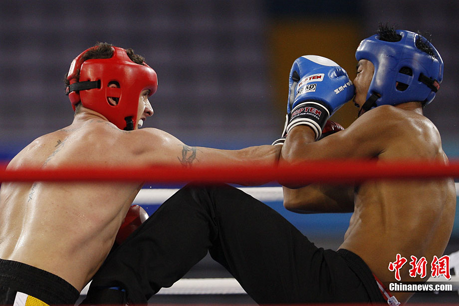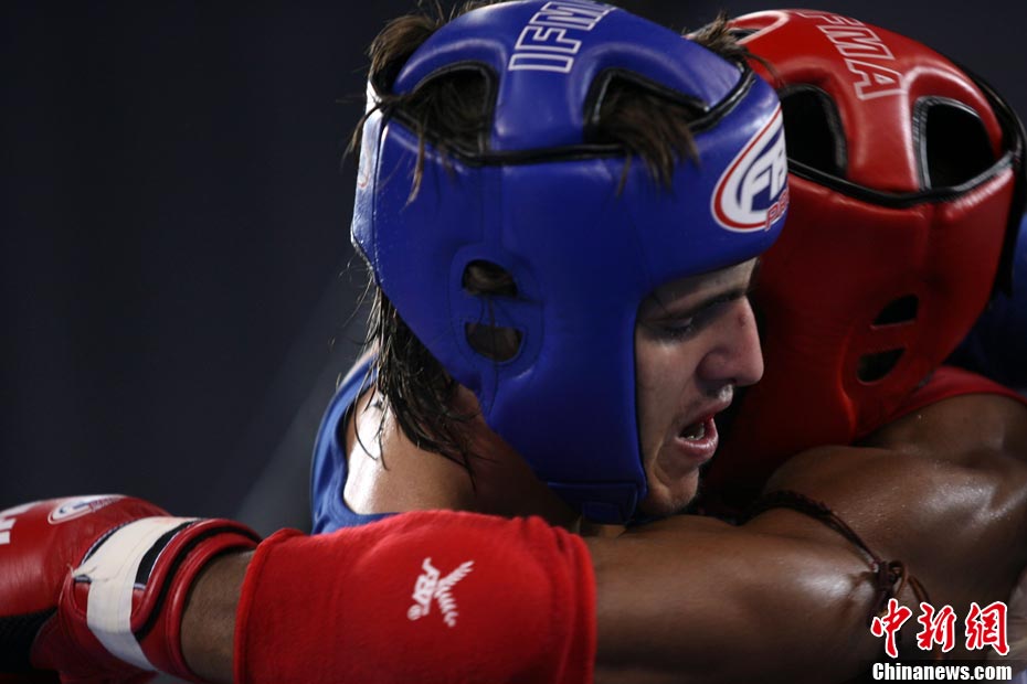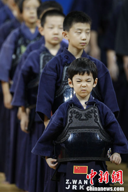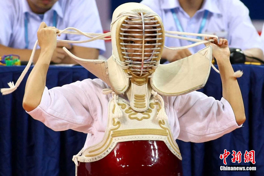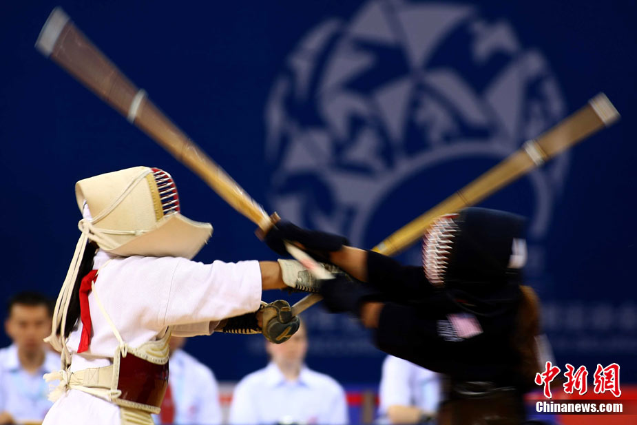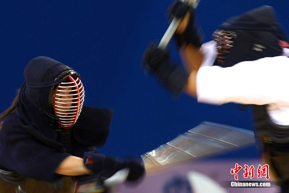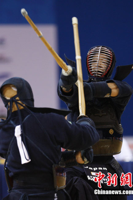 9月3日,2010年北京首屆世界武搏運動會劍道比賽在北京科技大學體育館開賽,當天舉行男、女個人賽預賽和決賽及女子特殊邀請賽預賽和決賽。圖為在男子個人邀請賽中,日本選手昭司寺本(Shoji TERAMOTO)(右)和巴西選手奧納卡(Ernesto Eisaku ONAKA)在比賽中。中新社記者 盛佳鵬 攝