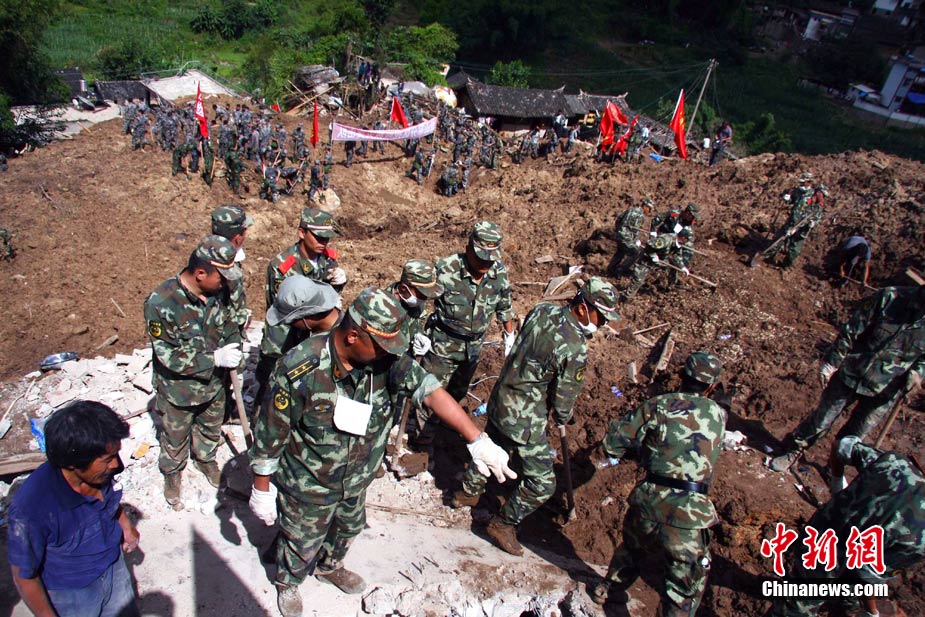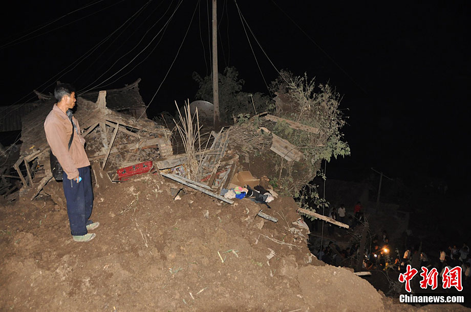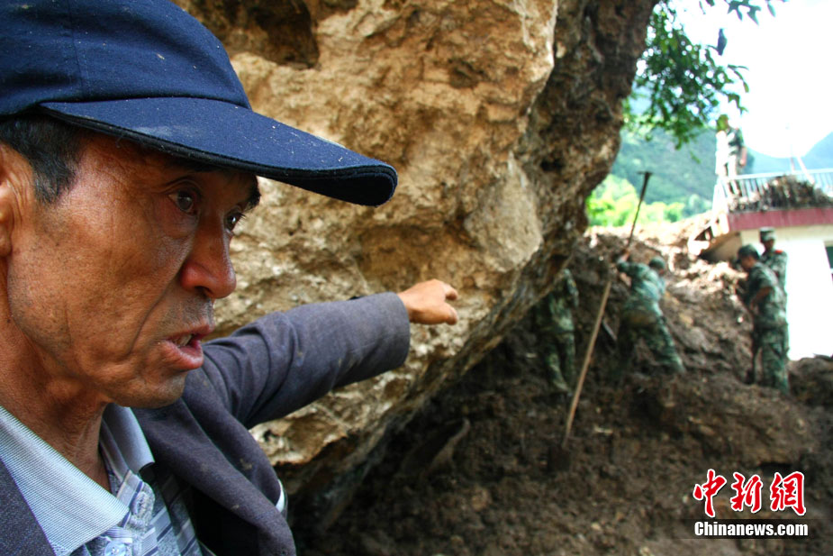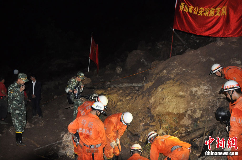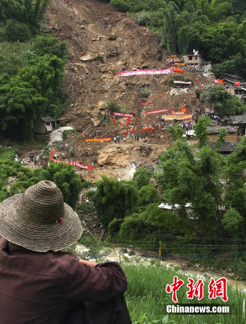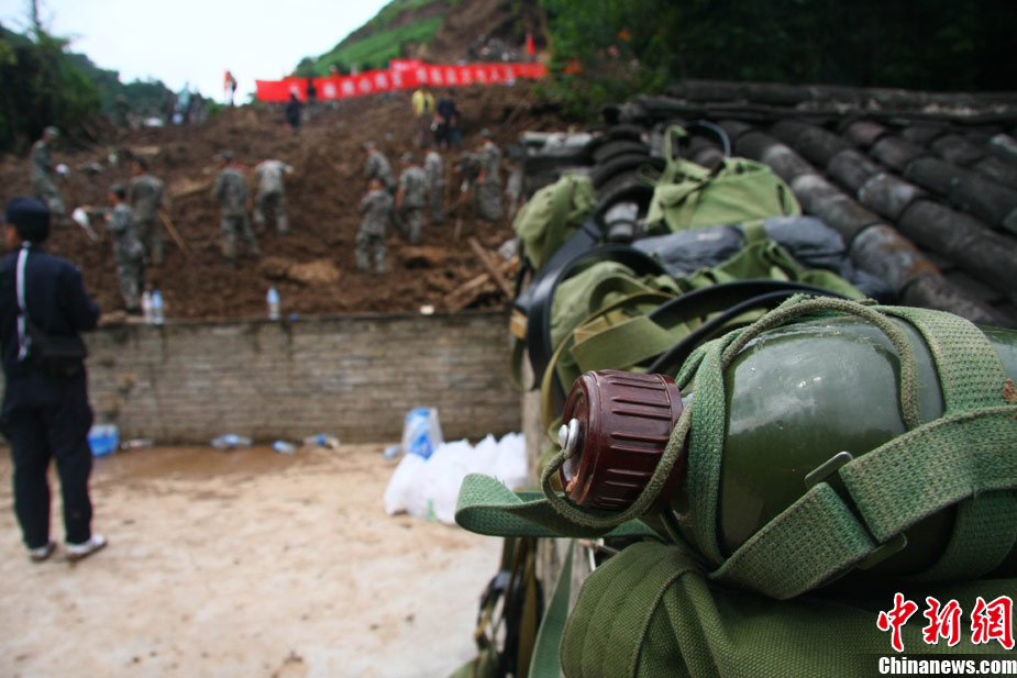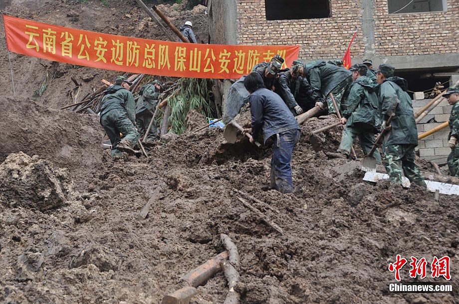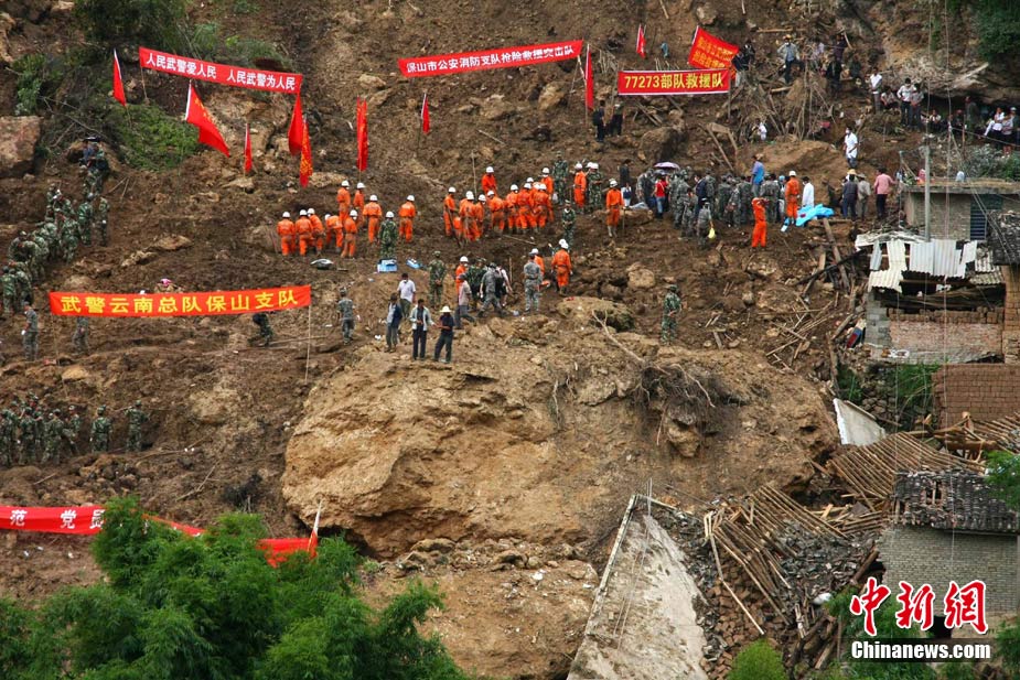9月1日發生在云南保山隆陽區瓦馬村的特大山體滑坡災害造成該村損毀嚴重,相關專家鑒定,該區存在重大安全隱患,不適宜再居住。相關專家組日前趕赴災區,為受災群眾進行災后重建選址工作。圖為地質觀測點的武警戰士正在監測救援現場地質情況,以防止次生災害的發生。中新社發 任東 攝