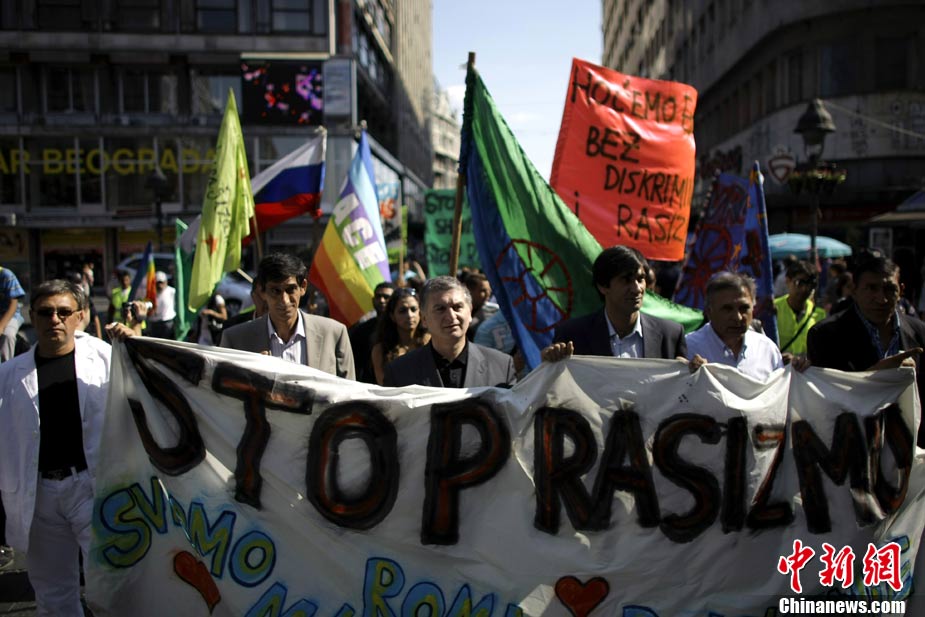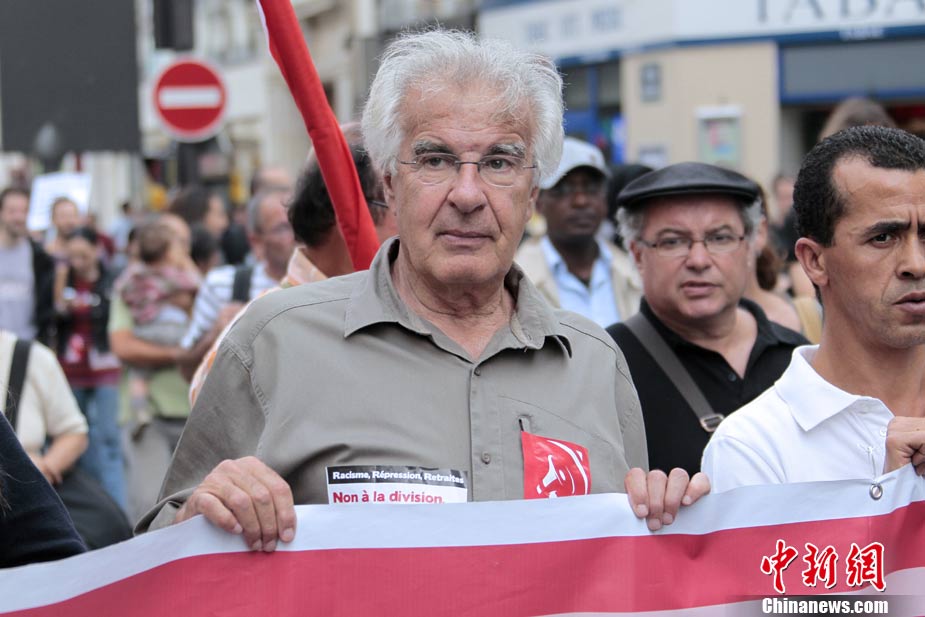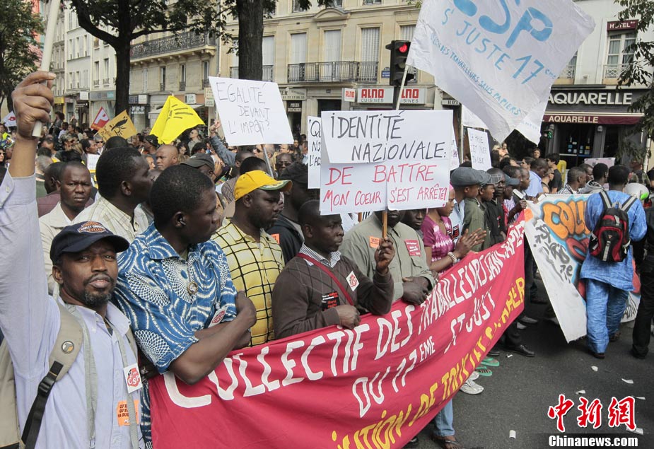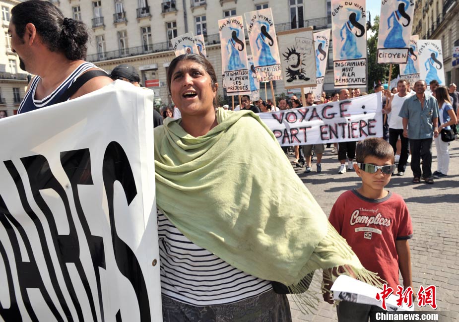 法國全國各地4日有數(shù)以萬計的群眾上街示威,抗議政府最近采取新政策,強行驅(qū)逐吉卜賽人出境。歐洲其它城市包括貝爾格萊德和羅馬,也有群眾游行聲援吉卜賽人。圖為在法國南特,民眾示威抗議政府強行驅(qū)逐吉普賽人。
