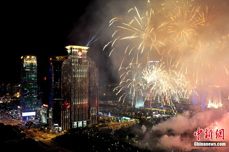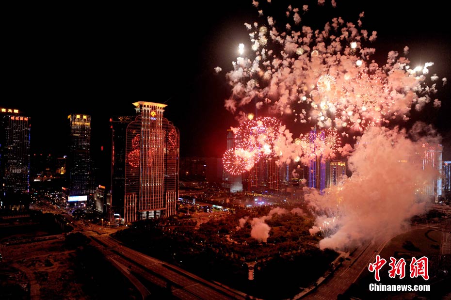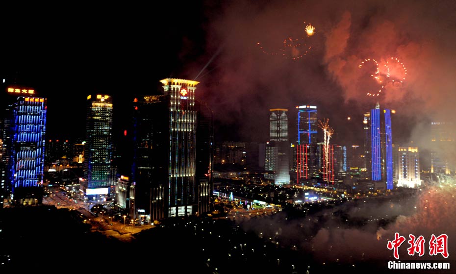 9月6日晚8點30分,深圳夜空璀璨絢麗,慶祝深圳經濟特區建立30周年焰火晚會在深南大道水晶島舉行。今晚燃放煙花數量145107發,主要品種19種,全長30分鐘,共四個樂章。深圳市民分別在蓮花山公園、市民中心、深南路、彩田路、會展中心等區域觀看深圳經濟特區30周年慶典煙花晚會。中新社記者 陳文 攝