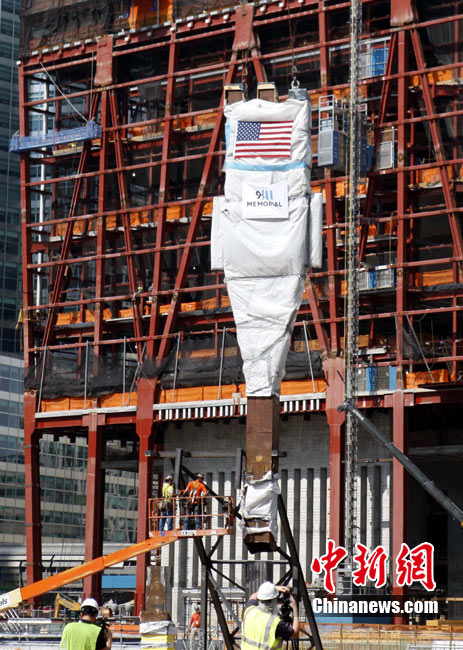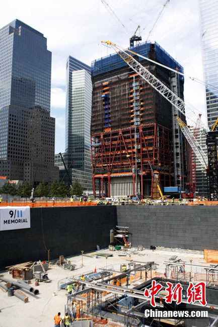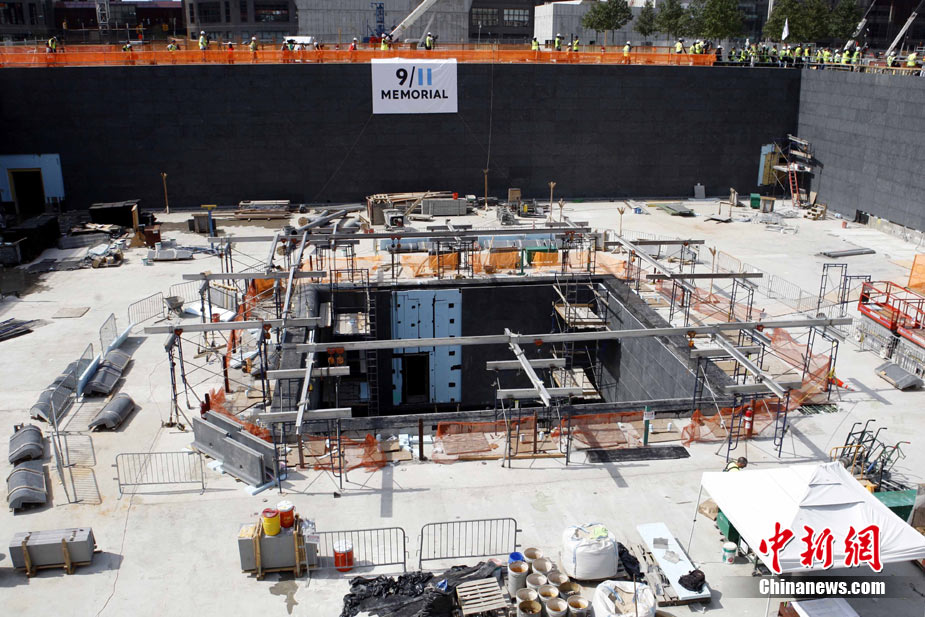 美國當地時間9月7日,記者在紐約世貿建筑工地現場看到,以原先世貿雙子塔樓基座為主體的兩個方形瀑布池業已成型,周圍也種上了些許綠樹。9·11紀念館館長喬·丹尼爾斯表示,肯定將在事件十周年紀念日當天開館。中新社記者 孫宇挺 攝
