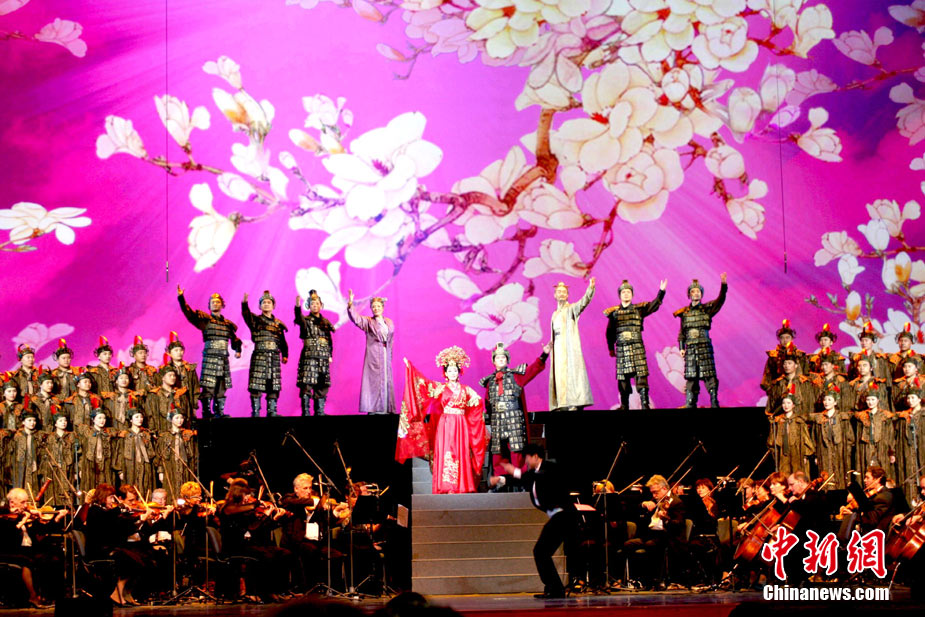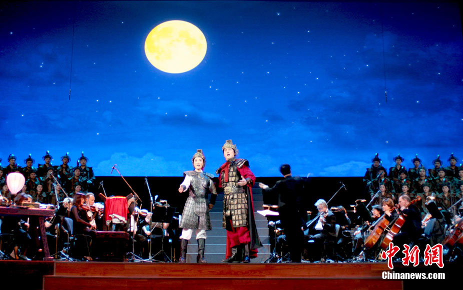 9月9日晚,中國人民解放軍總政治部歌舞團攜大型原創民族歌劇《木蘭詩篇》在莫斯科克里姆林宮大劇院成功演出。作為俄羅斯“漢語年”框架下的一項重要活動,此次赴俄首場演出由青年歌唱家譚晶出演花木蘭一角。中新社發 田冰 攝