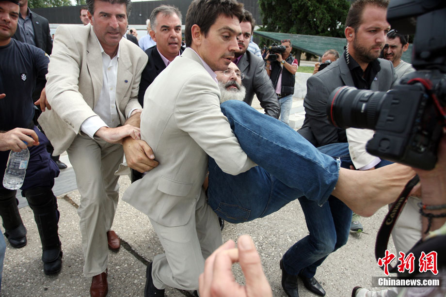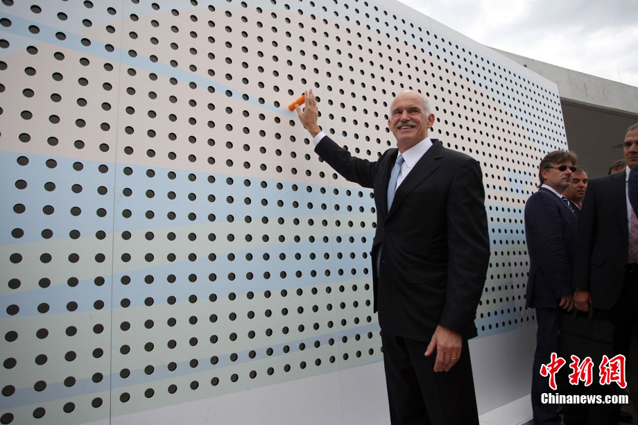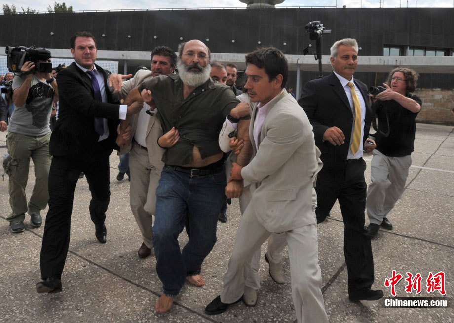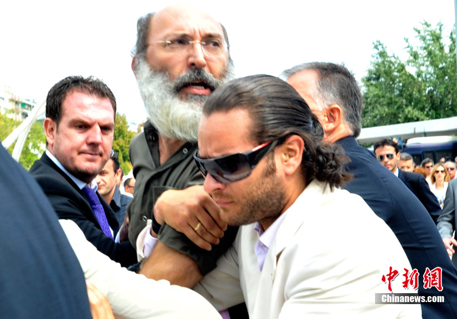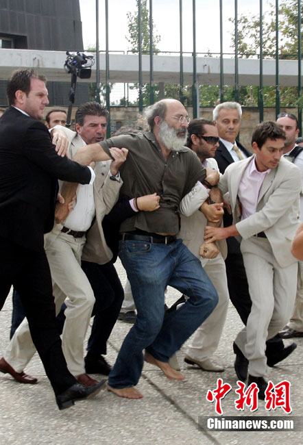 當地時間9月11日,在希臘北部城市塞薩洛尼基,希臘總理帕潘德里歐參觀塞薩洛尼基國際博覽會時遭一男子擲鞋襲擊,但沒有被鞋擊中。