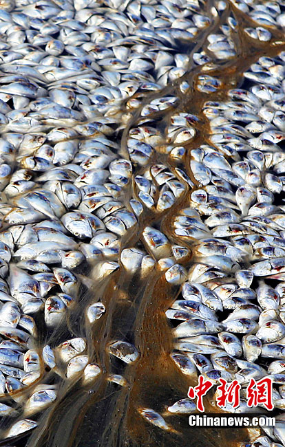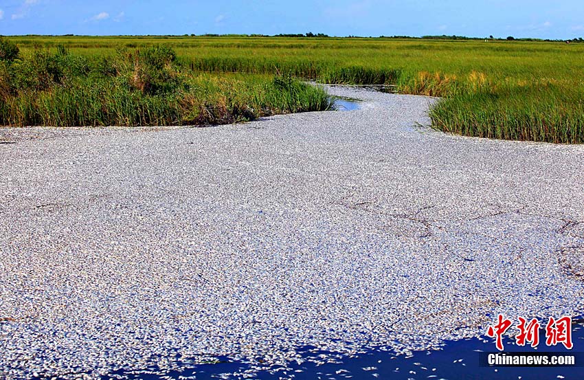 近日,人們在美國路易斯安那州普拉克明縣發現大批漂浮在緩流溪上的死亡魚群。目前,這批魚的死亡原因不明,但懷疑與墨西哥灣漏油事件有關。圖為9月10日在美國路易斯安那州普拉克明縣拍攝的大批死魚。