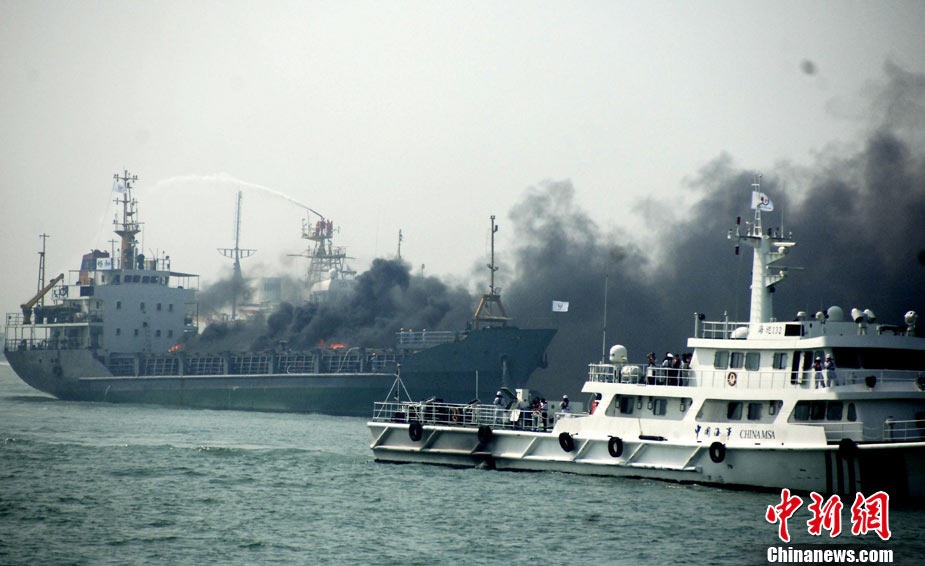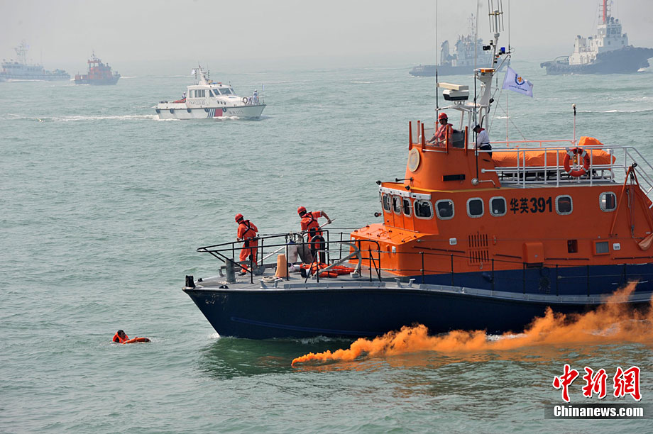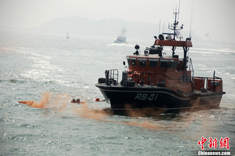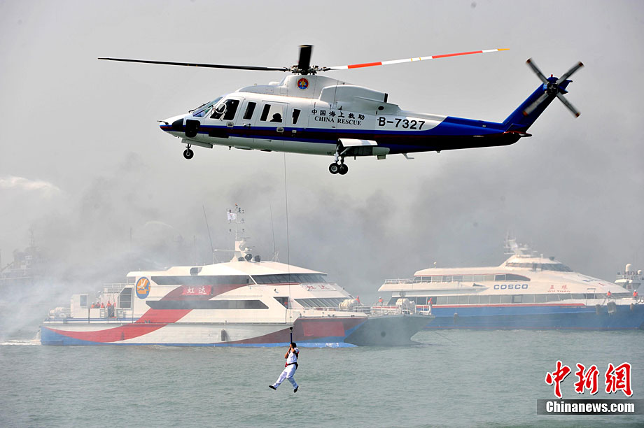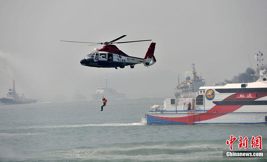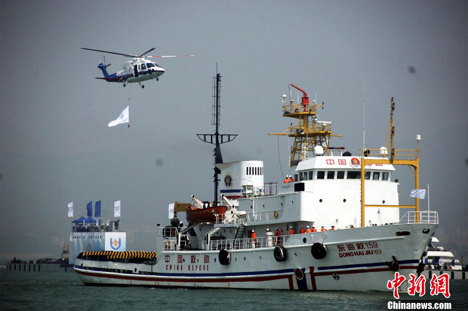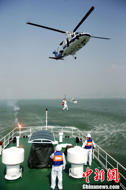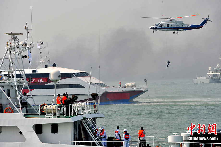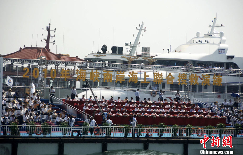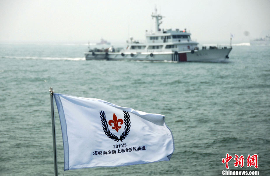 9月16日上午,2010年海峽兩岸海上聯合搜救演練在臺灣海峽的廈門、金門附近海域舉行。海峽兩岸海上搜救單位參演人數400多人,共動用搜救船舶14艘、救助飛機3架。其中大陸方面主要參演船舶9艘、救助直升機2架;臺灣方面主要參演船舶5艘、救助直升機1架。這是自2008年12月15日兩岸海上直航正式啟動以來,海峽兩岸海上搜救力量首次共同進行的大規模海陸空聯合搜救演練。圖為演練現場。中新社發 王東明 攝