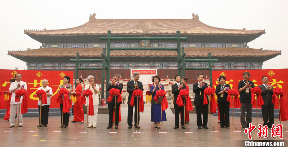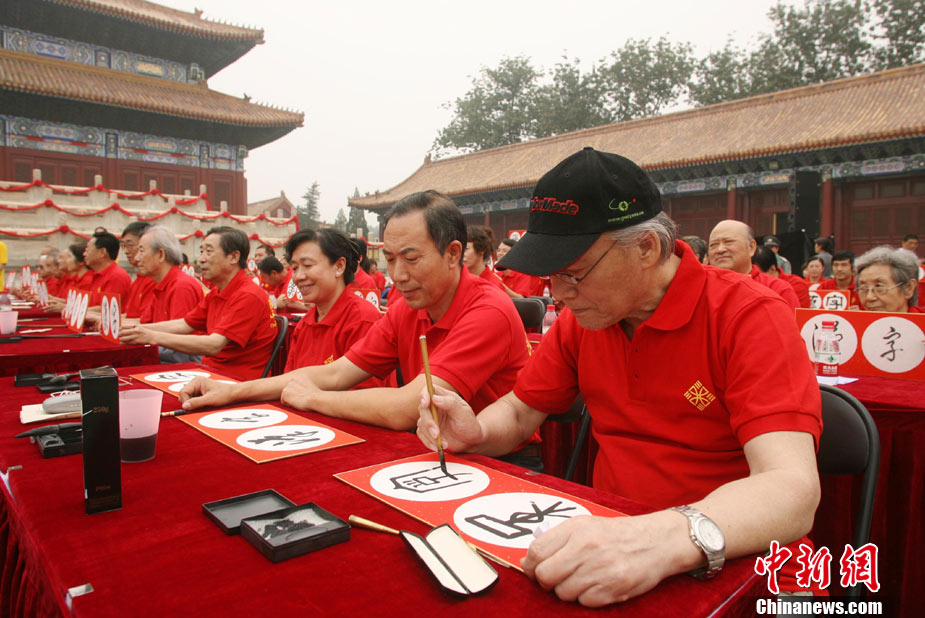 9月16日,北京兩百名書法愛好者在太廟前書寫各種字體的漢字,并共同完成“提筆、蘸墨、落筆、展卷”傳統(tǒng)程序。當(dāng)日,首屆“兩岸漢字藝術(shù)節(jié)”在北京太廟開幕。本次藝術(shù)節(jié)由中國藝術(shù)研究院、中華文化聯(lián)誼會、臺灣文化總會、河南省安陽市政府聯(lián)合主辦,中國藝術(shù)研究推廣中心、臺灣中華新文化發(fā)展協(xié)會共同承辦。中新社發(fā) 蘇丹 攝