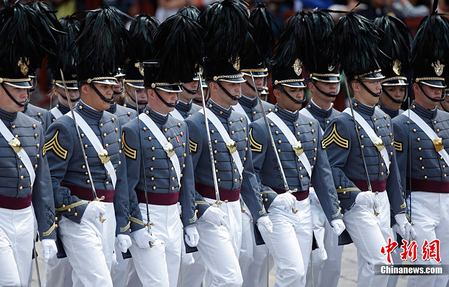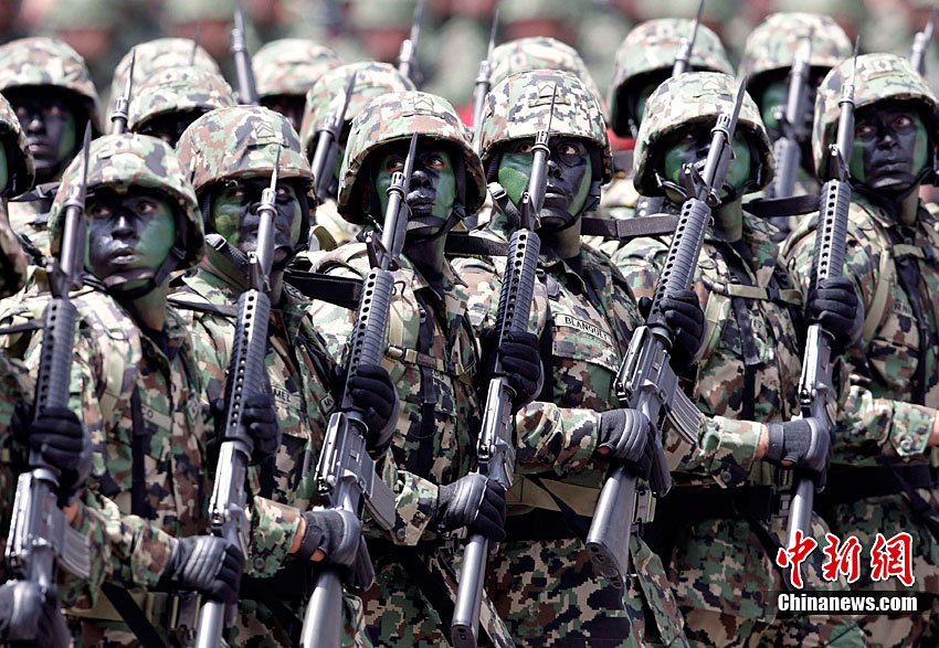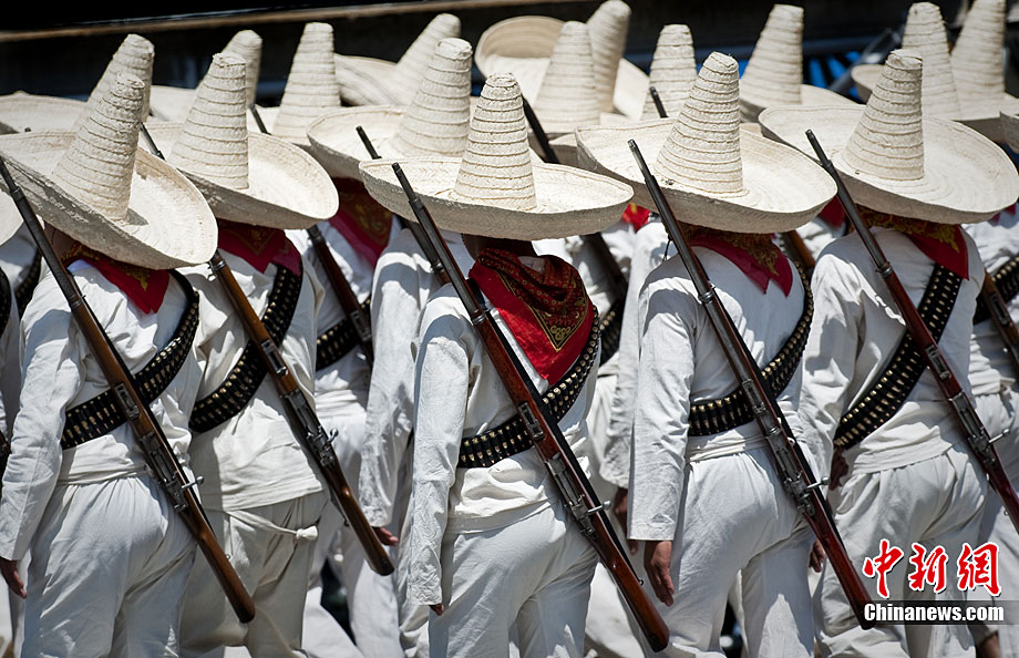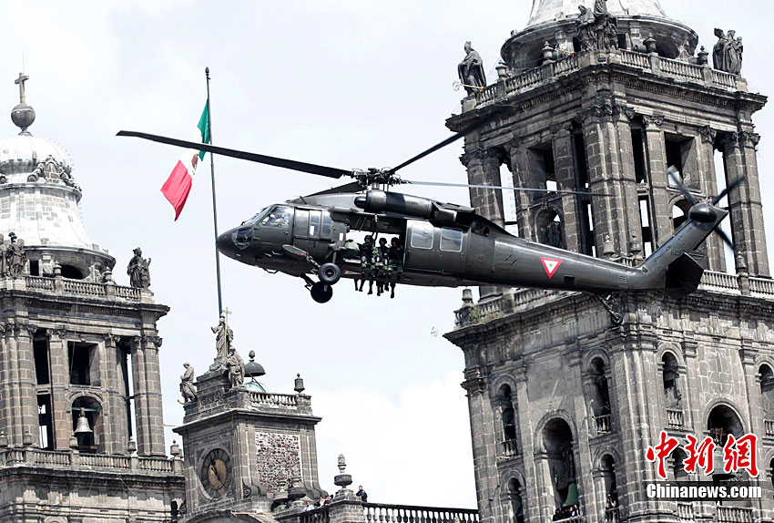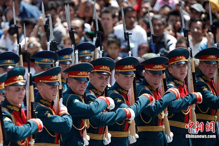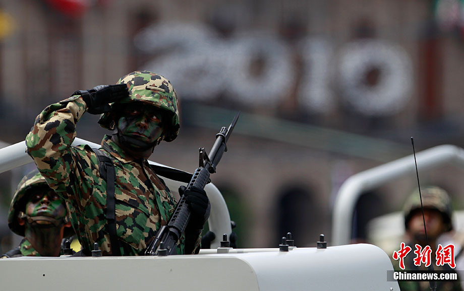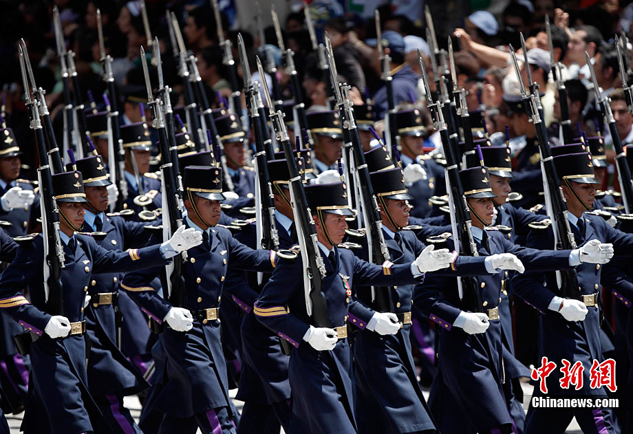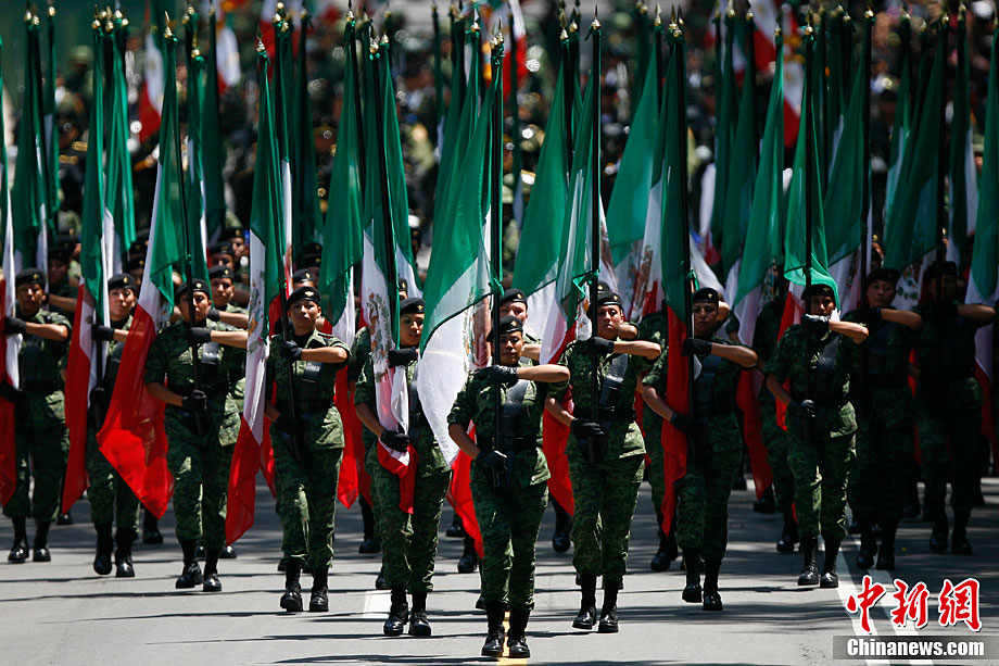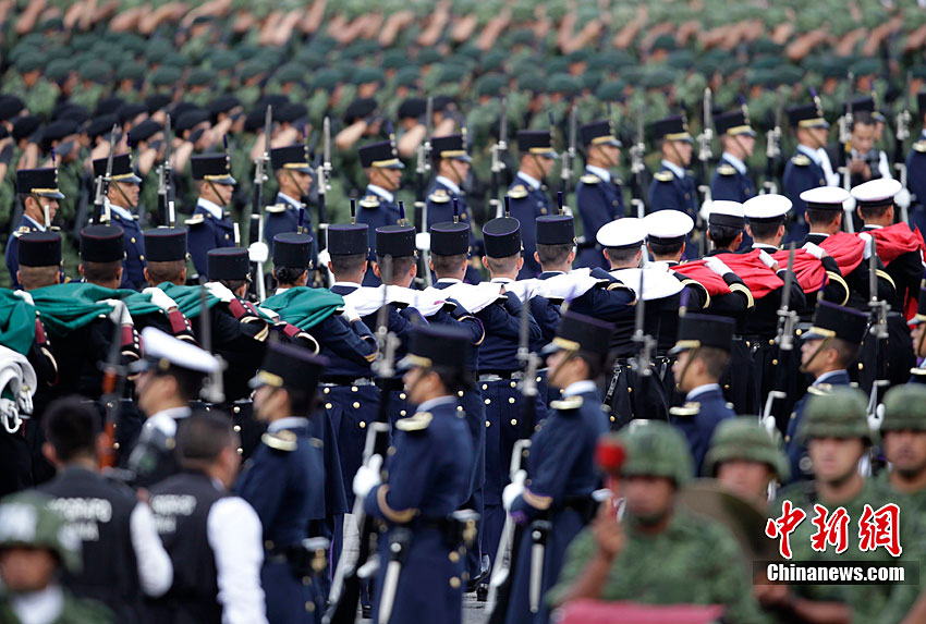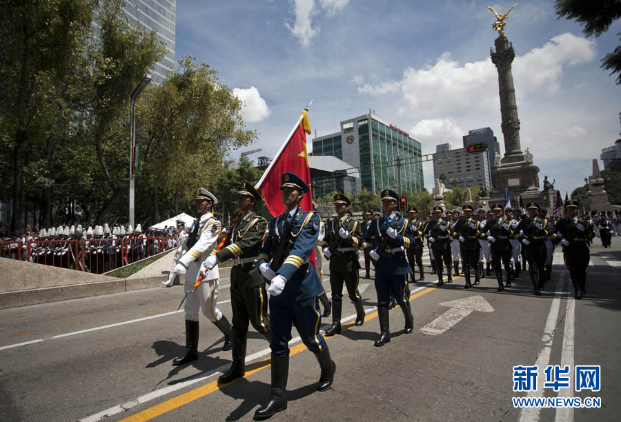 9月16日,在墨西哥首都墨西哥城,中國人民解放軍儀仗方隊參加墨西哥獨立200周年慶典閱兵。參加此次閱兵的中國儀仗隊由36人組成,其中34人編成方陣,最前方是1名旗手、5名護旗手,后隨1名陸軍指揮官,其身后列3隊,陸海空各1列、每列9人。這是解放軍儀仗部隊首次走出國門遠赴海外參加活動。