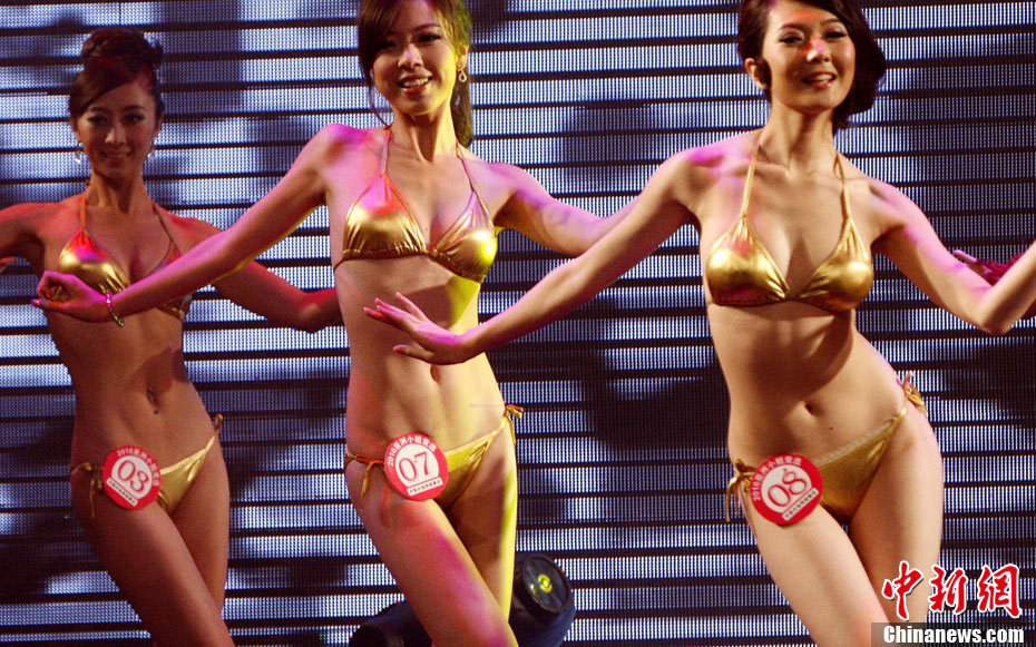9月24日晚,2010亞洲小姐競選中國內地網絡賽區總決賽在北京舉行,15位佳麗“火辣、性感”登場角逐,經過泳裝、云錦晚裝秀、才藝展示以及現場知識問答等環節,最后選自西南網絡賽區的5號王欣獲得冠軍、華北網絡賽區3號劉曉智獲得亞軍、華北網絡賽區10號何婭萌獲得季軍。圖為參賽佳麗展示風采. 中新社發 錢興強 攝