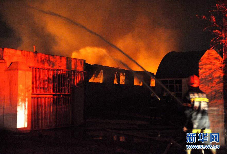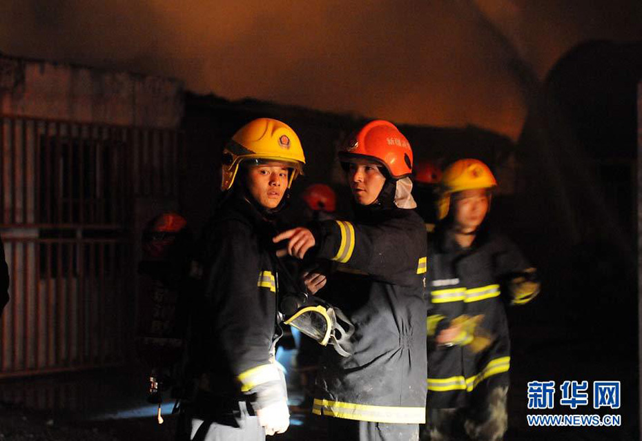 9月25日,消防官兵在火災現場進行撲救。當日晚間,烏魯木齊國際機場跑道東側圍墻外一家“恒利擠塑板廠”發生火災并有爆炸,由于有爆炸物散落到機場跑道,烏魯木齊國際機場關閉了一個小時,清理跑道。圖片來源:新華網 王菲 攝