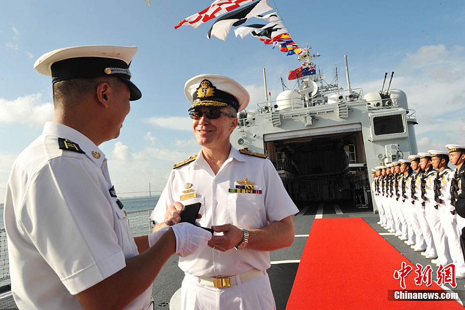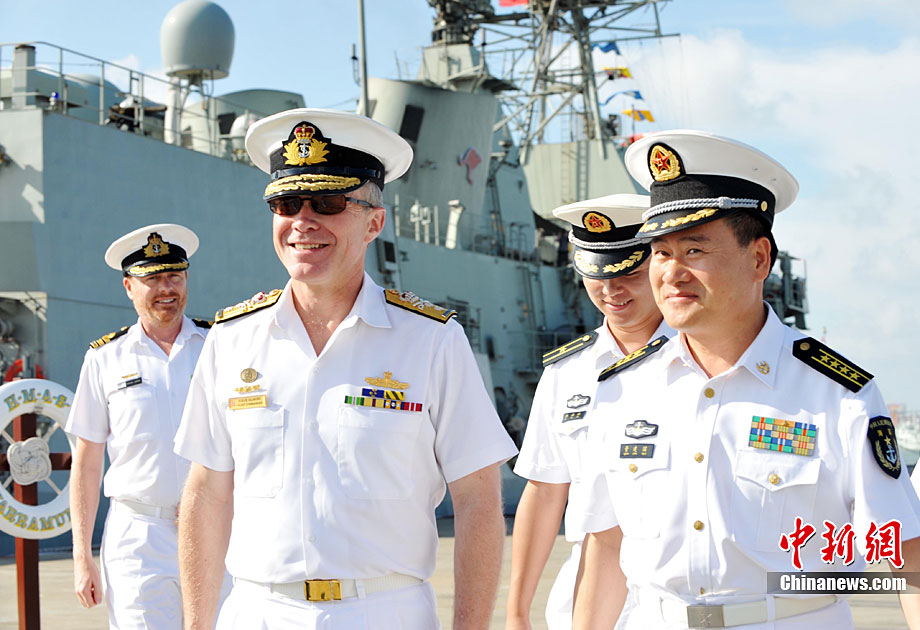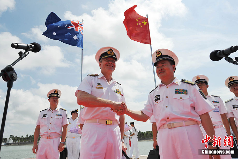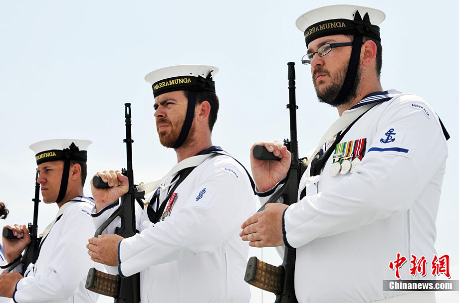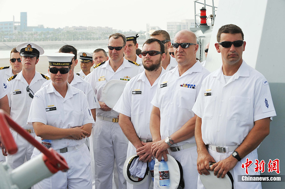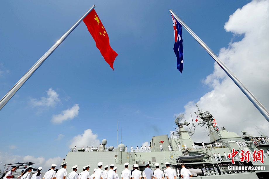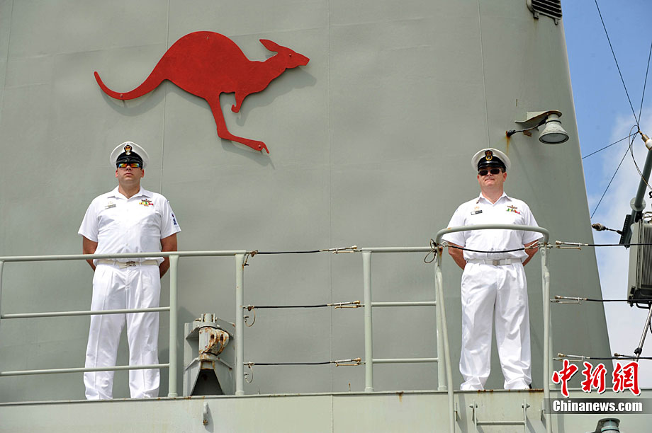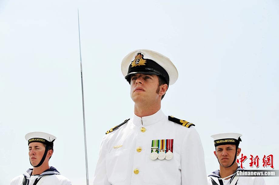 9月26日,應中國人民解放軍海軍邀請,澳大利亞海軍艦隊司令吉爾摩少將率海軍“瓦拉蒙加”號護衛艦抵達湛江某軍港進行友好訪問,南海艦隊舉行了隆重的歡迎儀式。中新社記者 陳文 攝