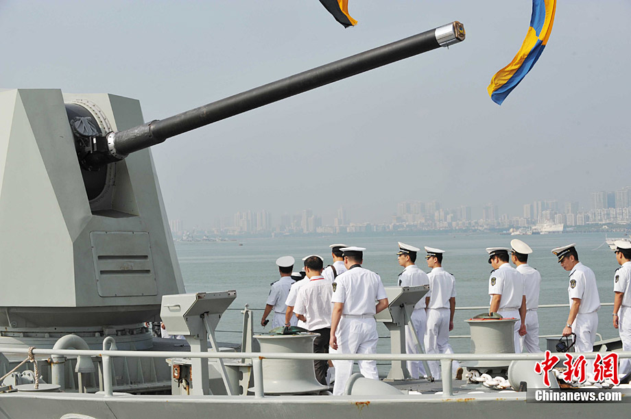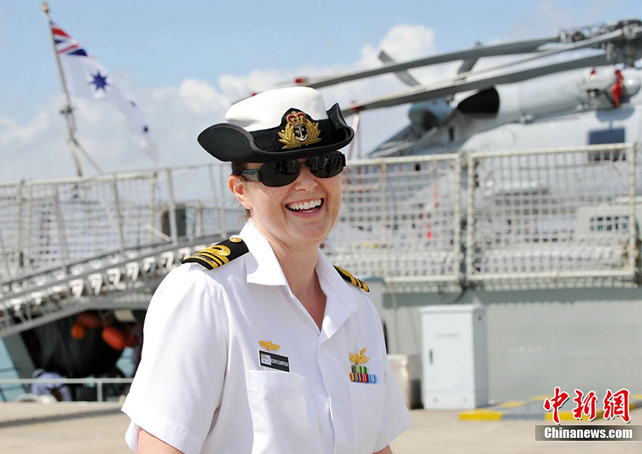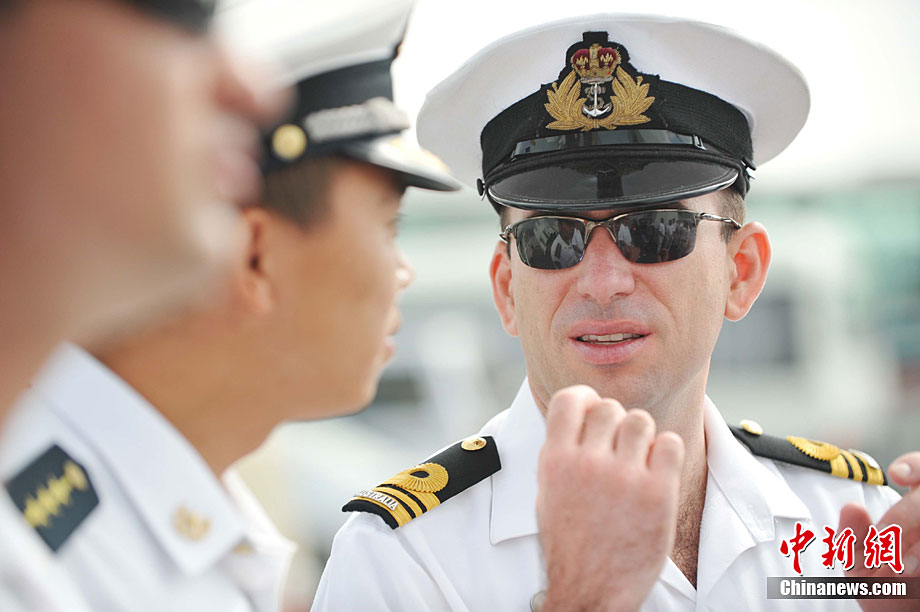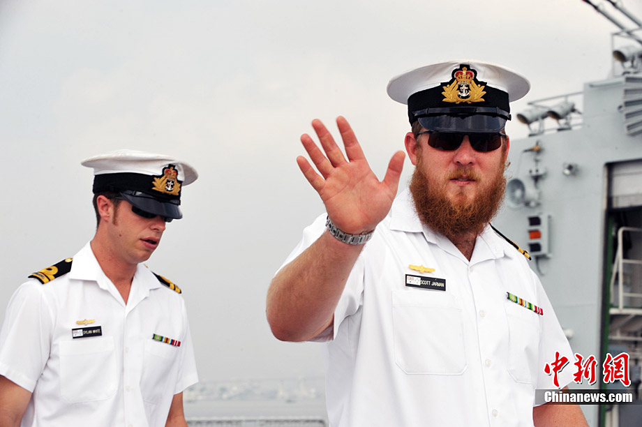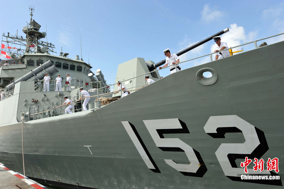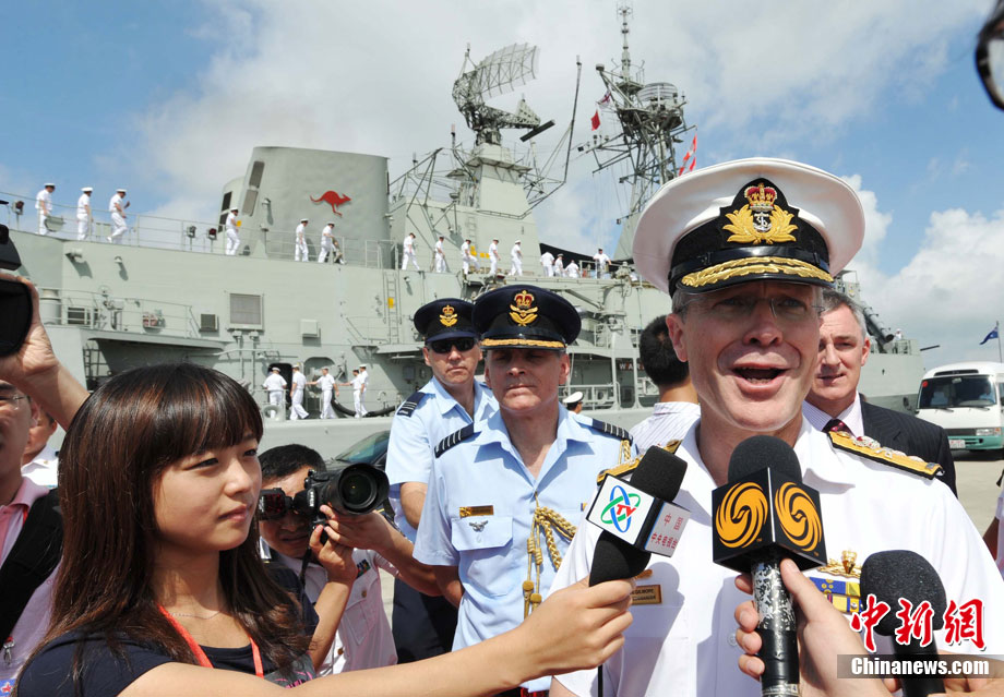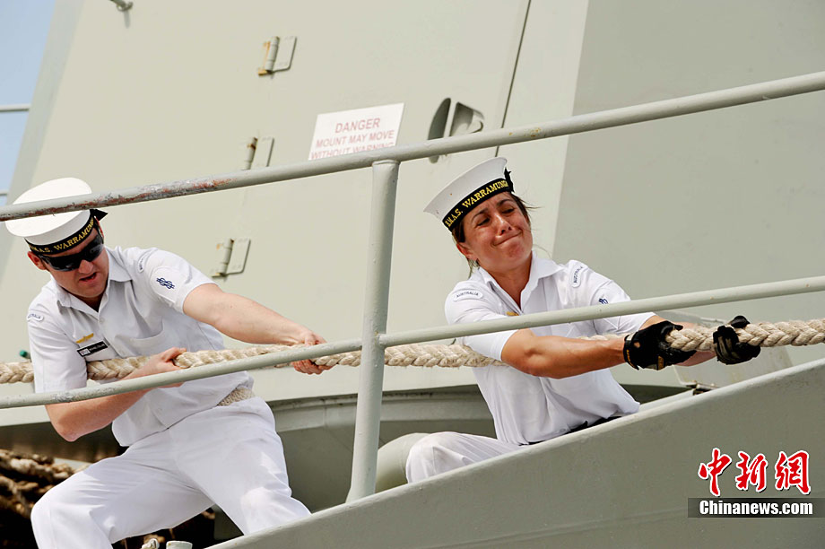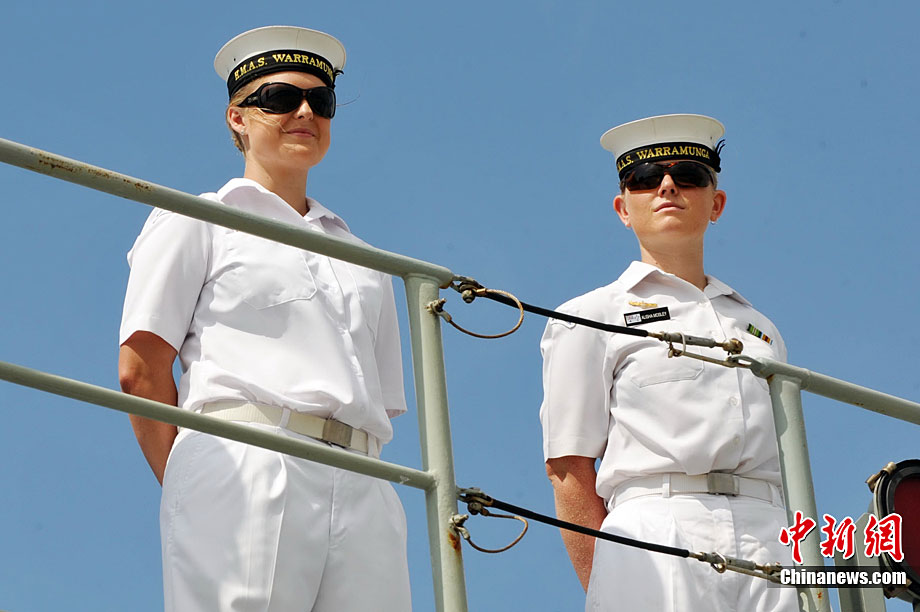 9月26日,應中國人民解放軍海軍邀請,澳大利亞海軍艦隊司令吉爾摩少將率海軍“瓦拉蒙加”號護衛艦抵達湛江某軍港進行友好訪問,南海艦隊舉行了隆重的歡迎儀式。中新社記者 陳文 攝