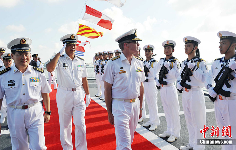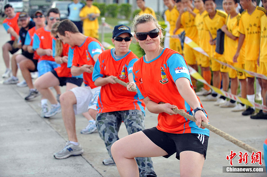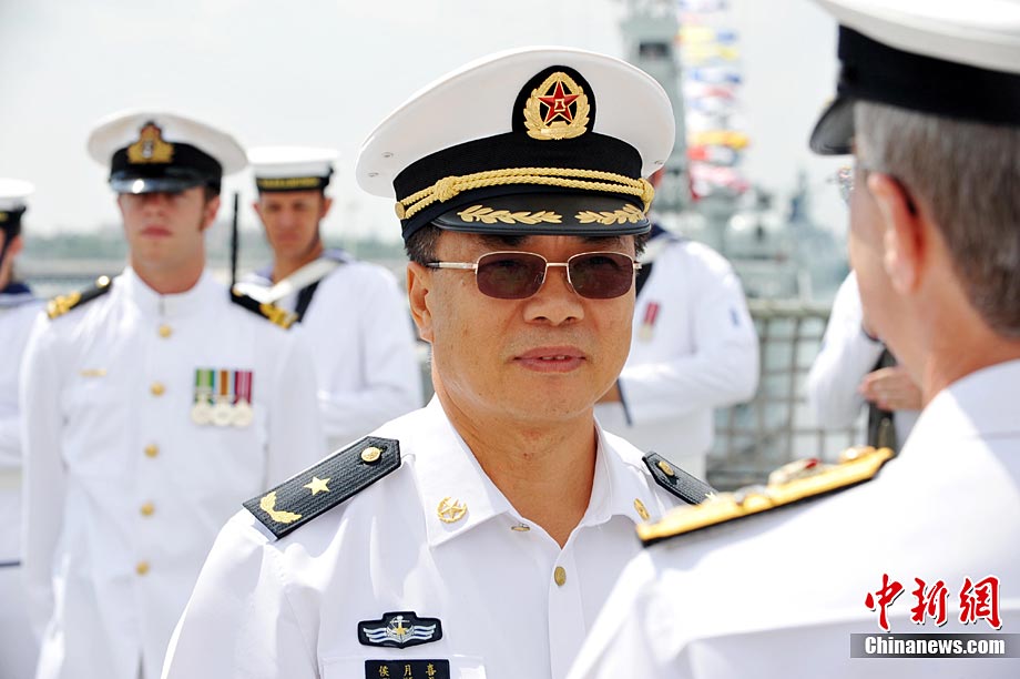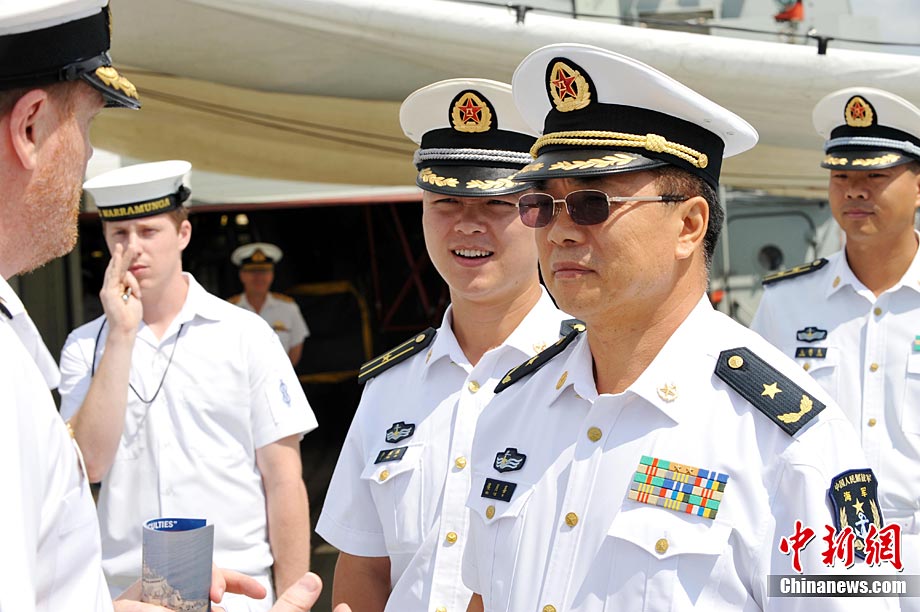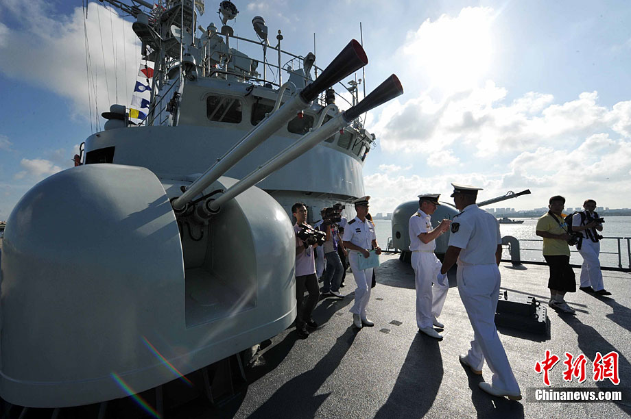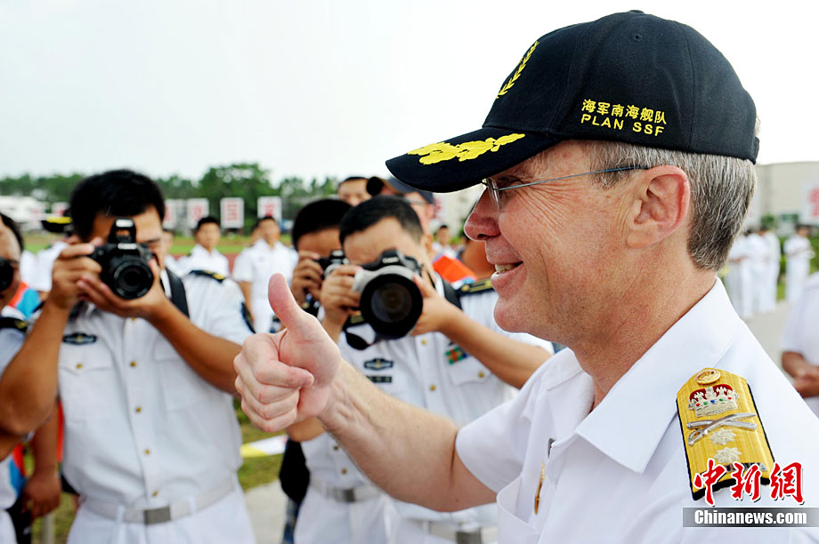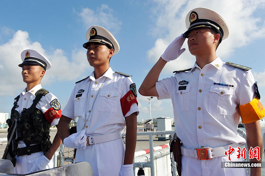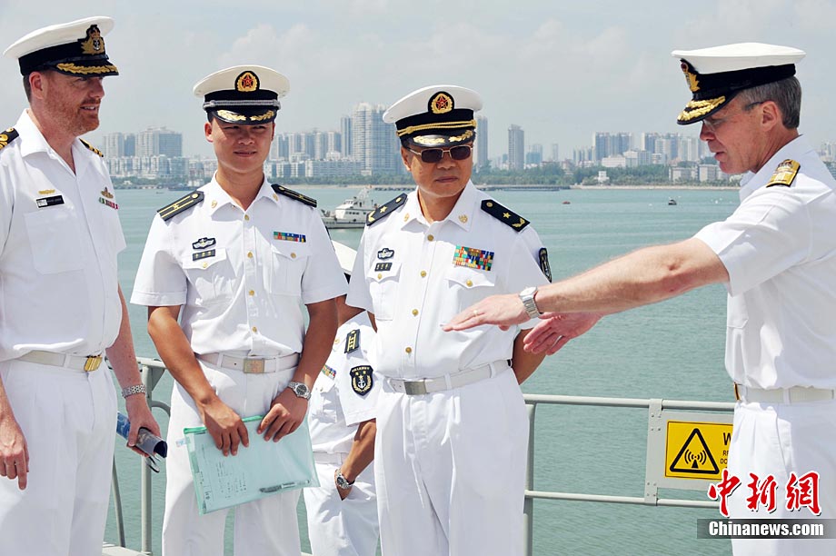 9月26日,應中國人民解放軍海軍邀請,澳大利亞海軍艦隊司令吉爾摩少將率海軍“瓦拉蒙加”號護衛艦抵達湛江某軍港進行友好訪問,南海艦隊舉行了隆重的歡迎儀式。中新社記者 陳文 攝