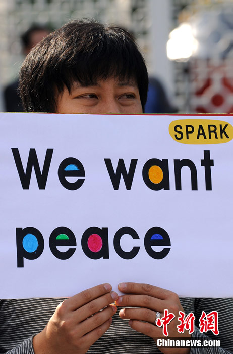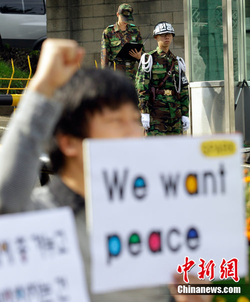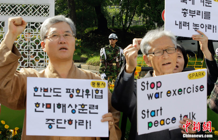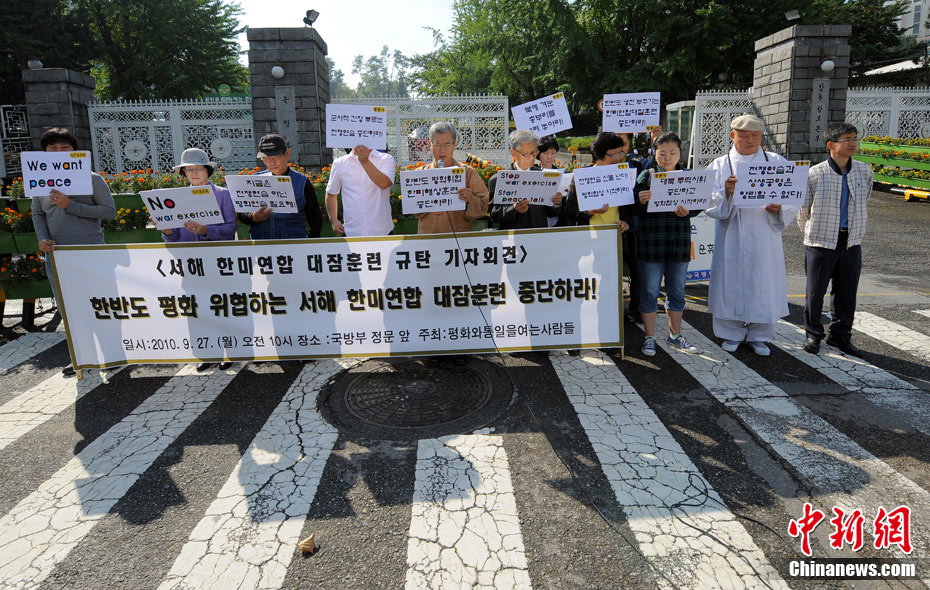 韓美反潛聯合軍事演習27日在韓國西部海域(黃海)拉開帷幕。當日,一些韓國反戰人士在國防部門前集會抗議美韓聯合軍演。