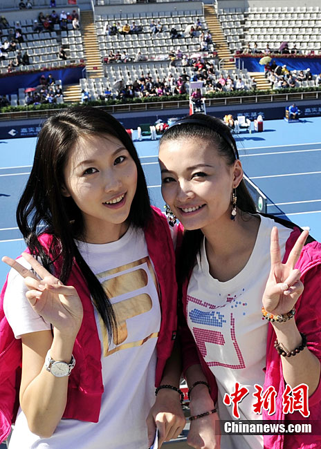 10月4日,時尚中網代言人、第五屆中國職業模特大賽冠軍趙晨池,首屆亞洲超級模特大賽冠軍王慧在北京亮相時尚運動品牌FILA展臺,與現場的球迷朋友們開展了一場別開生面的網球游戲體驗活動,助陣FILA及參與本屆中網的FILA四位代言人。中新社記者 錢興強 攝