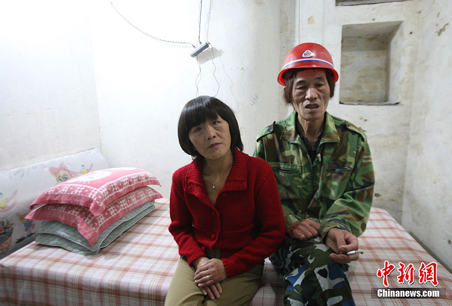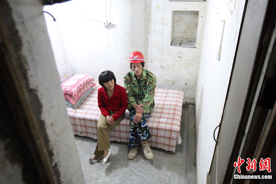 10月5日,河南鄭州,陳新年和妻子劉舒拉在自己的“地下標間”里。劉舒拉表示自己和老伴都喜歡跳舞,保持良好的心態、快樂的生活,夫妻之間相互恩愛。64歲的陳新年,老家河南省太康縣,28歲時赴平頂山做礦工。4年來,陳新年發揮個人礦工特長在居住的棚戶地下6米處,挖了一個50平方米左右的地下室,包括一套十幾平方米大的標間。中新社記者 王中舉 攝