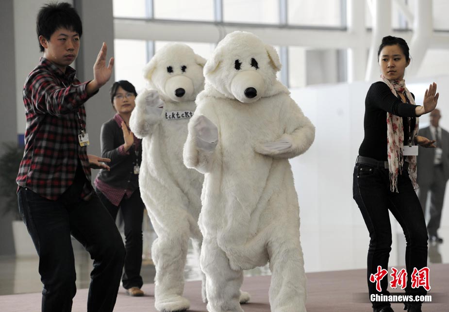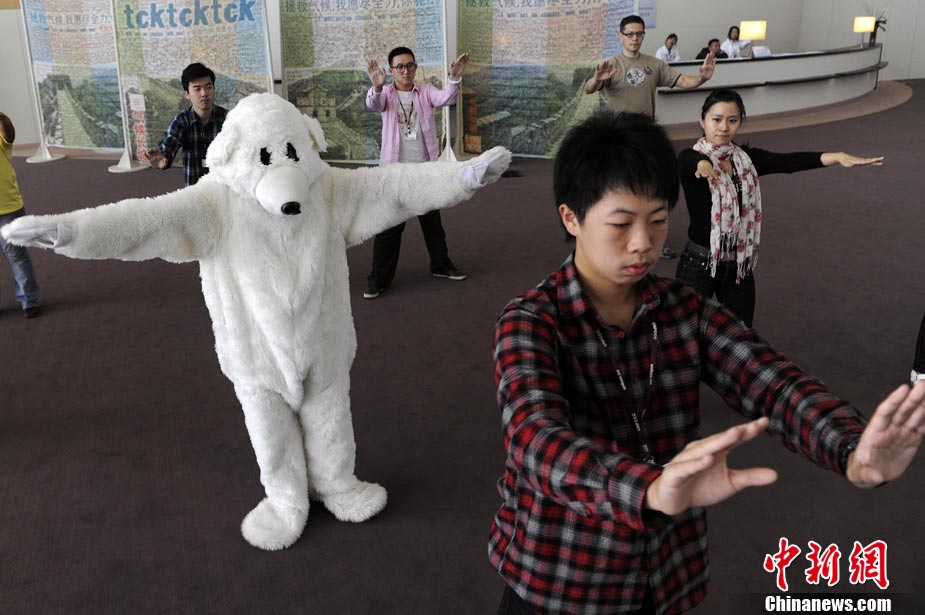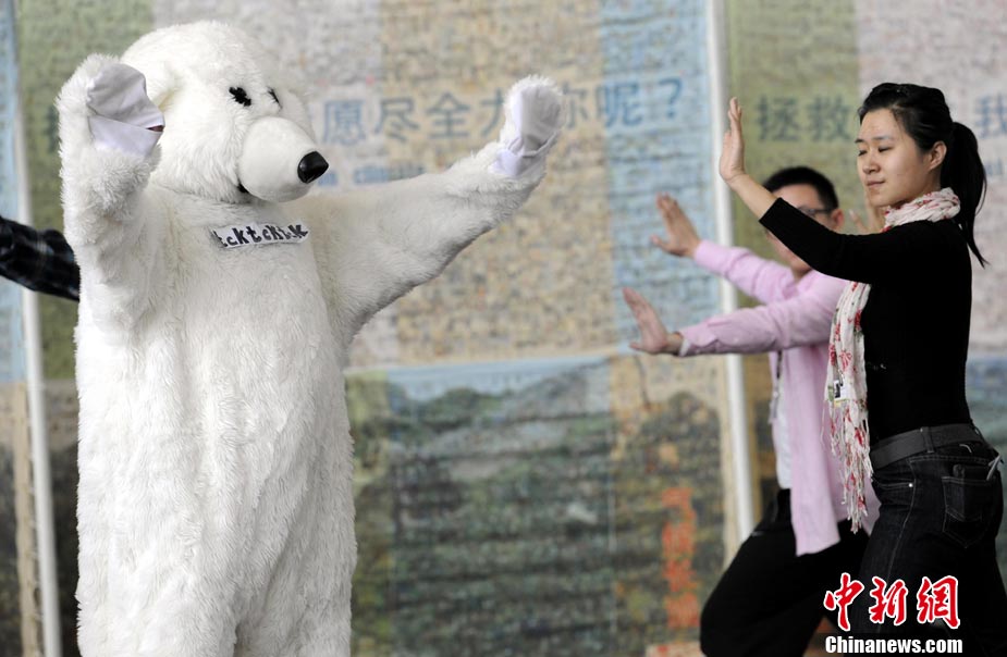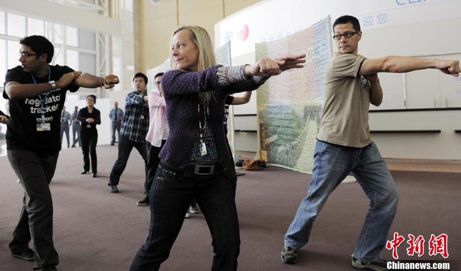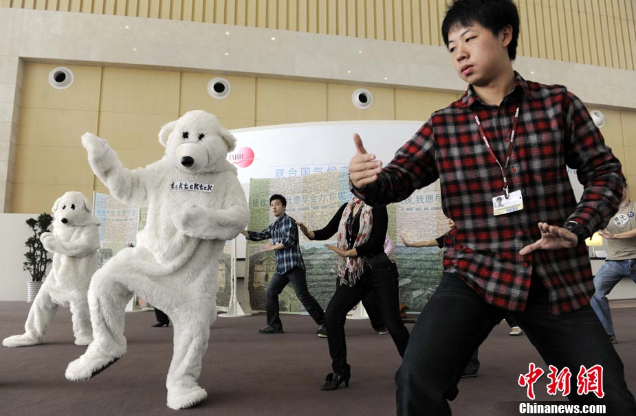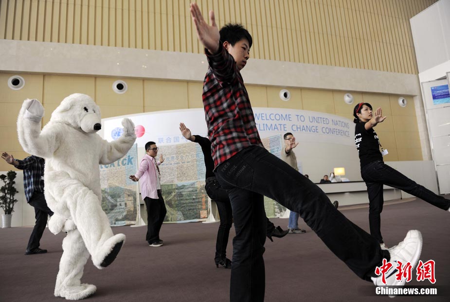 10月6日,聯合國氣候變化國際談判天津會議繼續舉行。全球氣候行動聯盟(TckTckTck 運動)特意安排了一個“北極熊”打太極的活動,邀請各國代表進入會場之前加入打太極拳。希望這兩天談判各方達成一個 “balanced package"(顧及各方利益的均衡協議),并以此警示人們愛護環境,拯救地球氣候。該組織由200個來自中國以及世界其他國家民間組織組成。 中新社記者 劉震 攝