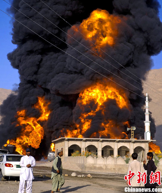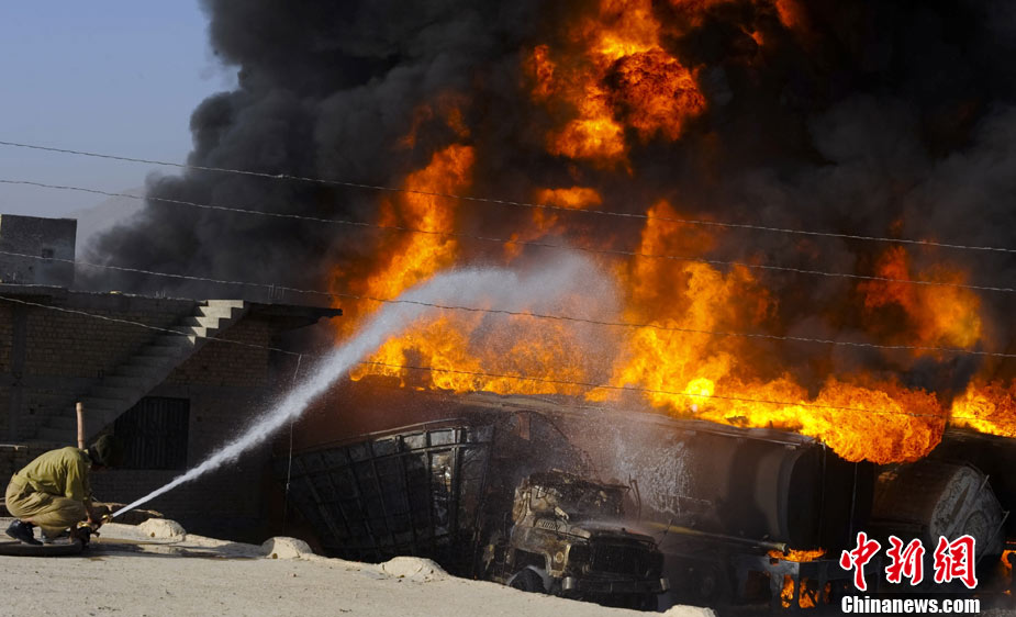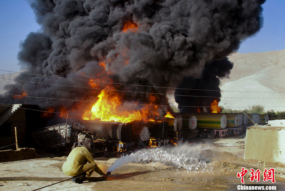 10月6日早晨,20多輛北約油罐車在巴基斯坦西部城市奎達附近被一伙身份不明的武裝分子燒毀,警方稱可能有人員傷亡。據報道稱,火勢非常猛烈,從距離很遠的地方都能看到。消防隊員正在實施緊急滅火作業。