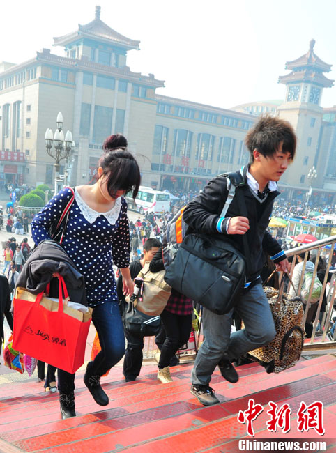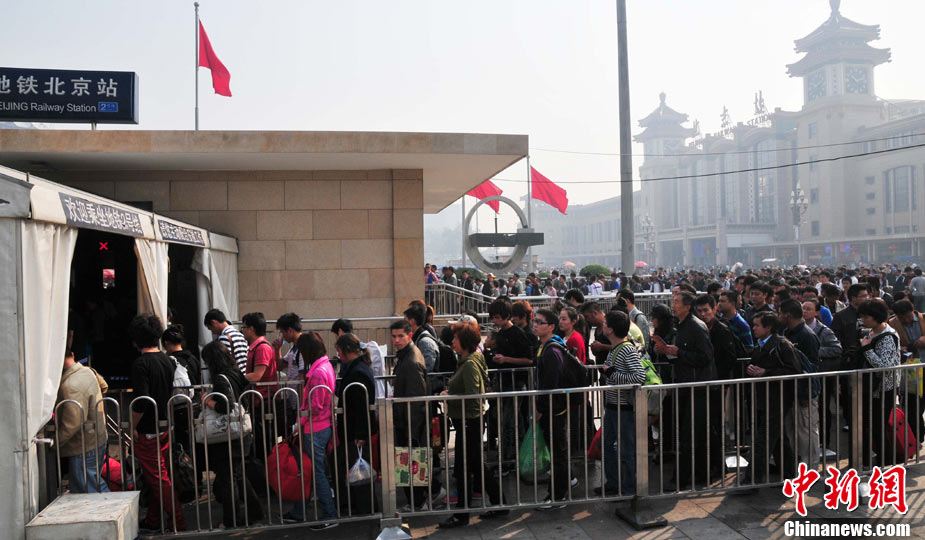 2010年10月6日,國慶“十一”黃金周長假即將結(jié)束,北京站、北京西站迎來返程客流高峰。樊甲山 攝 圖片來源:CFP視覺中國