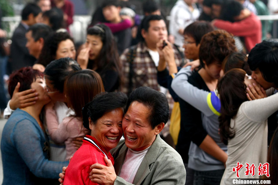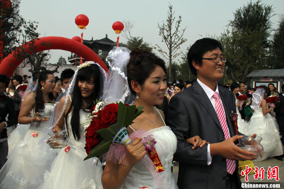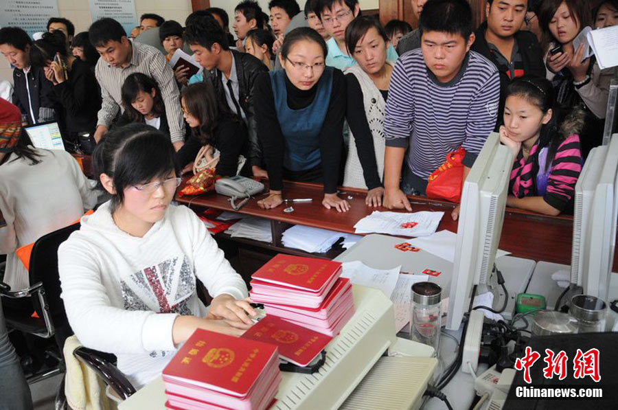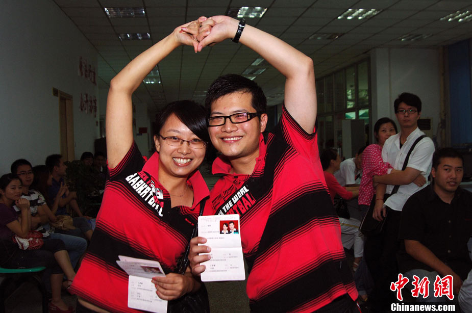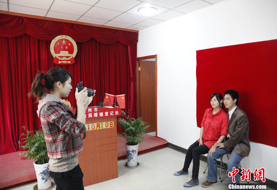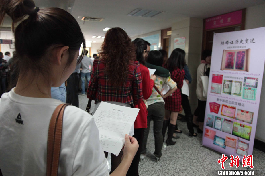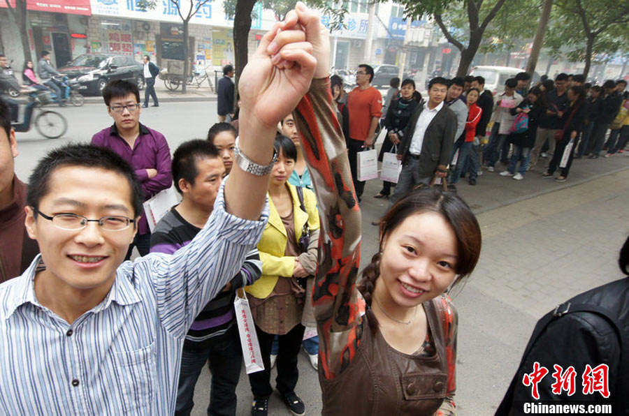 2010年10月10日,全國(guó)各地新人辦理結(jié)婚登記。很多新人選擇被寓意“十全十美”的好日子領(lǐng)結(jié)婚證。圖為鄭州出現(xiàn)結(jié)婚登記高峰,導(dǎo)致各區(qū)民政局婚姻登記處門前都排起長(zhǎng)長(zhǎng)的隊(duì)伍。一對(duì)新人在長(zhǎng)長(zhǎng)的隊(duì)伍中手挽手排除等候。沙浪 攝 圖片來(lái)源:CFP視覺(jué)中國(guó)
