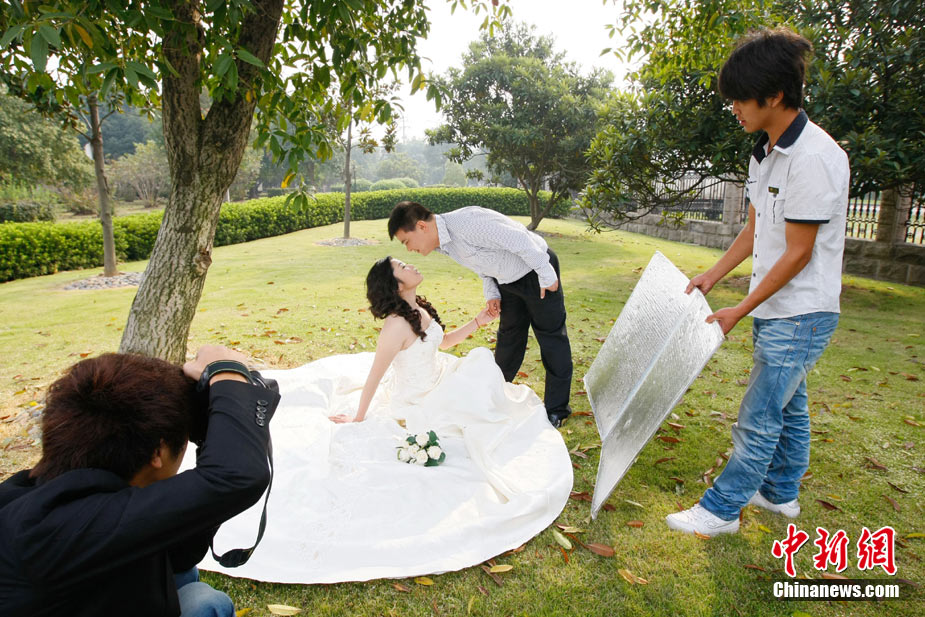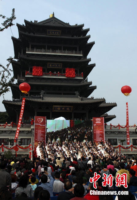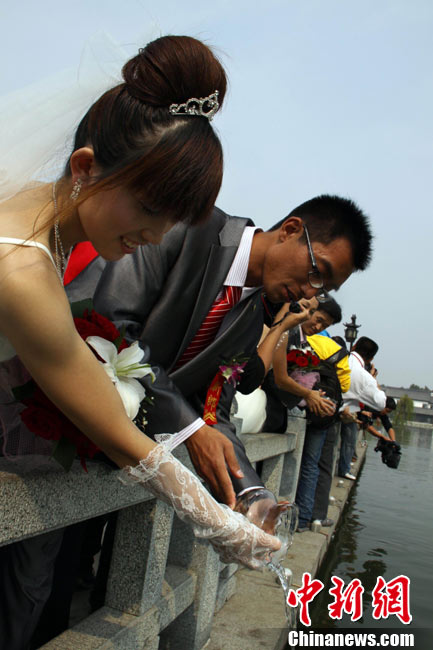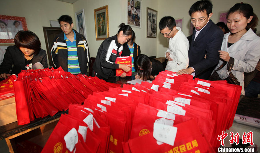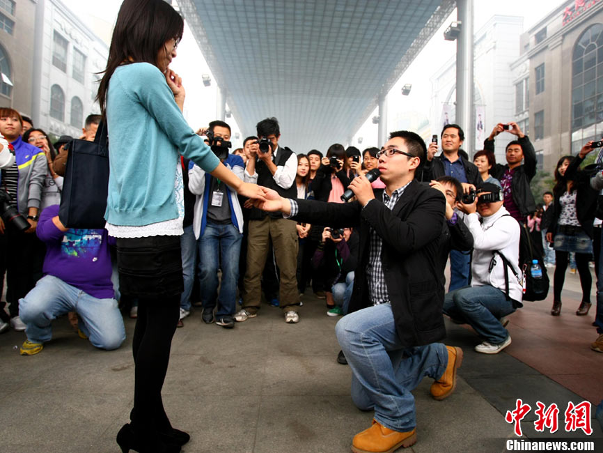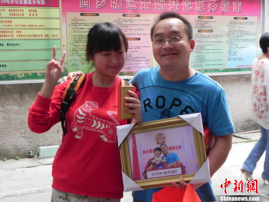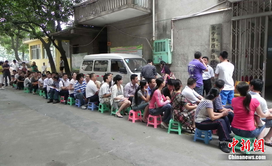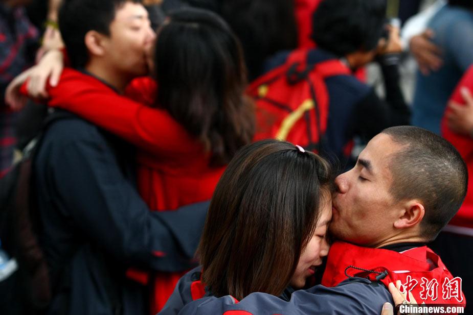 2010年10月10日,全國(guó)各地新人辦理結(jié)婚登記。很多新人選擇被寓意“十全十美”的好日子領(lǐng)結(jié)婚證。圖為鄭州出現(xiàn)結(jié)婚登記高峰,導(dǎo)致各區(qū)民政局婚姻登記處門前都排起長(zhǎng)長(zhǎng)的隊(duì)伍。一對(duì)新人在長(zhǎng)長(zhǎng)的隊(duì)伍中手挽手排除等候。沙浪 攝 圖片來(lái)源:CFP視覺(jué)中國(guó)
