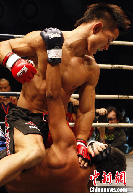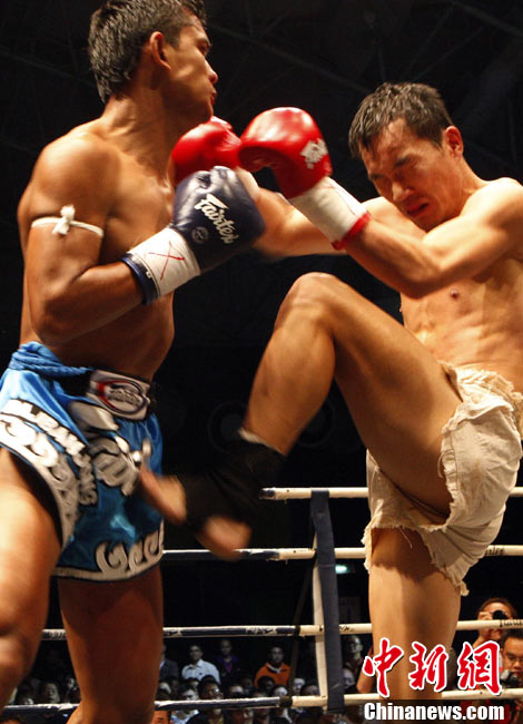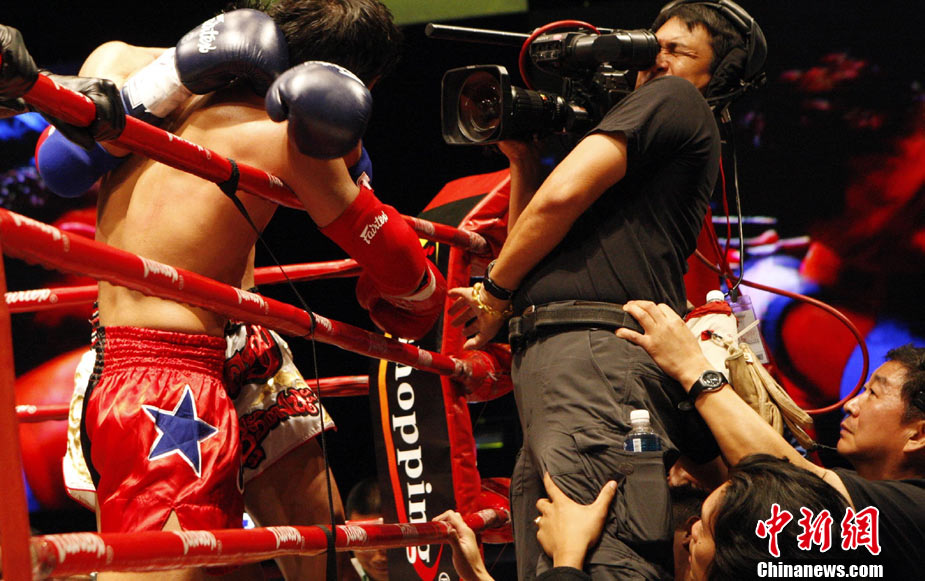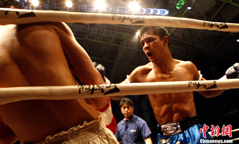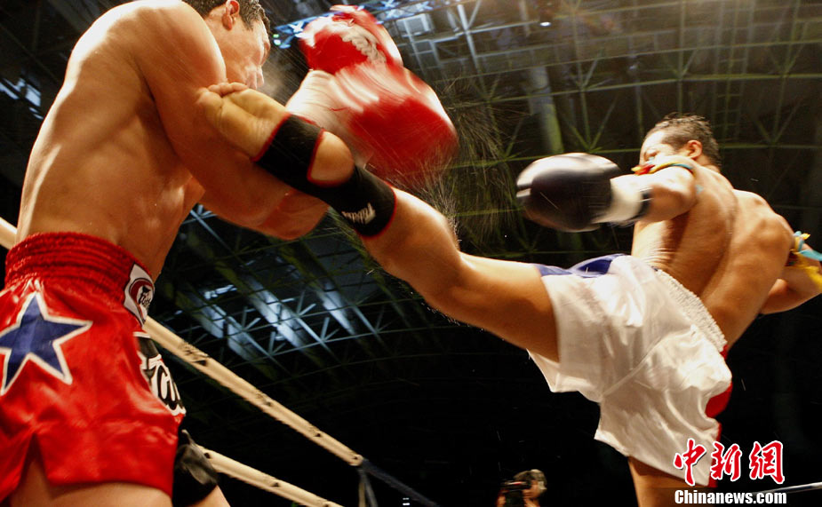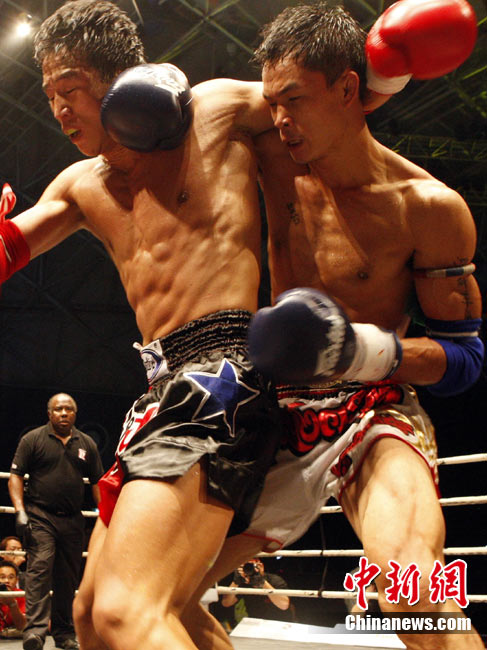 10月9日晚,由馬來西亞IPC國際集團和中國國際文化傳播中心以及英雄傳說賽事機構聯手主辦的“英雄傳說-決戰云頂”世界搏擊王者爭霸賽暨中泰拳王爭霸戰在馬來西亞吉隆坡云頂舉行。圖為泰國拳王雅桑克萊與中國王冠對決。 中新社記者 錢興強 攝