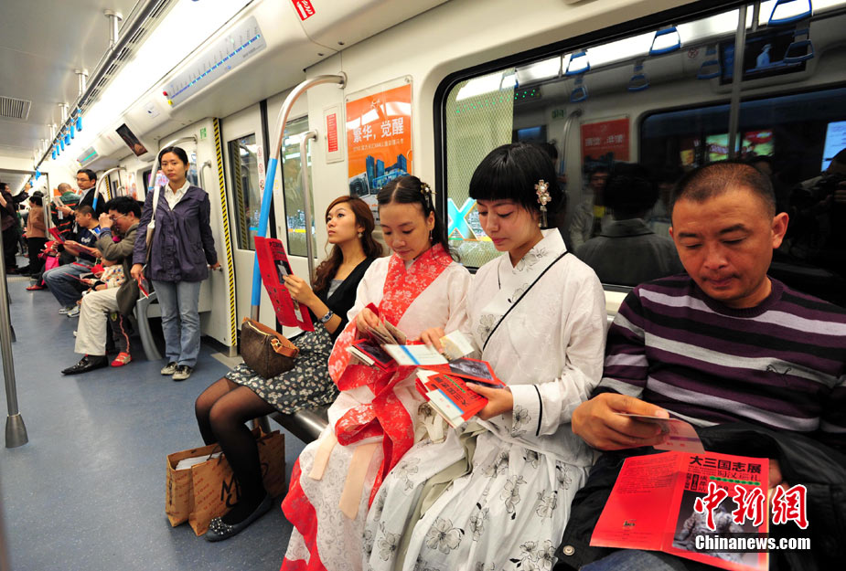 10月10日,成都一民間文化組織發(fā)起身著漢服乘坐新近開通的成都地鐵一號線活動(dòng),旨在感受現(xiàn)代交通的同時(shí),傳遞傳統(tǒng)文化。游地鐵的參與者們分別展示了直裙、曲裙、襖裙、束胸儒裙等不同款式的漢服,既包括了上朝禮服,也有百姓日常穿著的服飾。參與者們身著漢服乘坐地鐵,吸引了大量市民的目光,借此機(jī)會(huì)參與者們向乘客介紹了漢服的相關(guān)知識(shí)。安源 攝