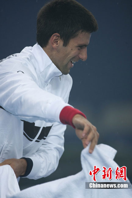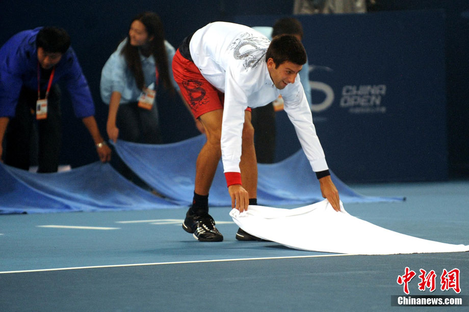 10月10日,總獎金額為210萬美元的ATP'500中網公開賽進入最后一天的爭奪,衛冕冠軍德約科維奇與西班牙名將費雷爾之間的男單決賽因雨中斷,比賽暫停時小德以3-1的比分暫時領先。中新社記者 富田 攝
