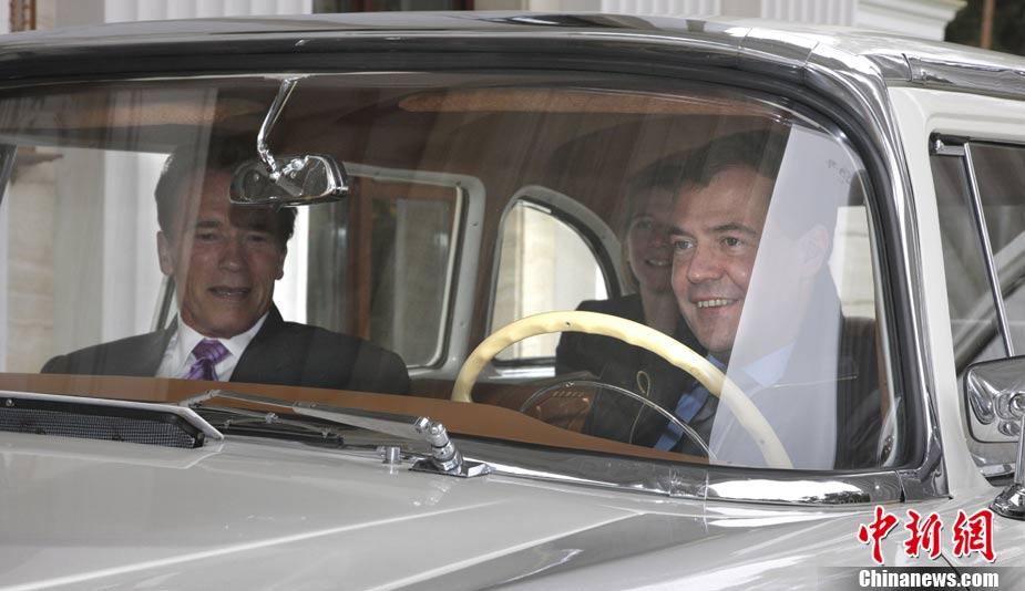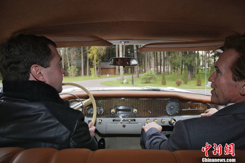 10月11日,莫斯科,美國加州州長施瓦辛格訪問俄羅斯,與俄羅斯總統梅德韋杰夫會面。梅德韋杰夫總統還為施瓦辛格客串了一把“司機。”