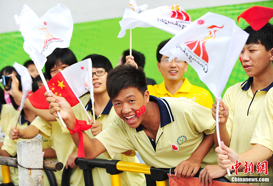 10月13日,備受矚目的第16屆廣州亞運會火炬?zhèn)鬟f在廣東省中山市舉行;鹁?zhèn)鬟f從孫文紀念公園出發(fā),火炬手有科學家、音樂家、漫畫家、美術家、企業(yè)家等80名火炬手接力,全長11.2公里。中新社記者 陳文 攝