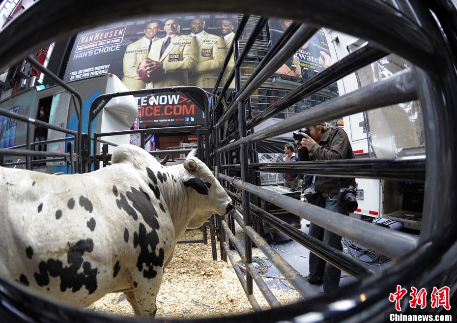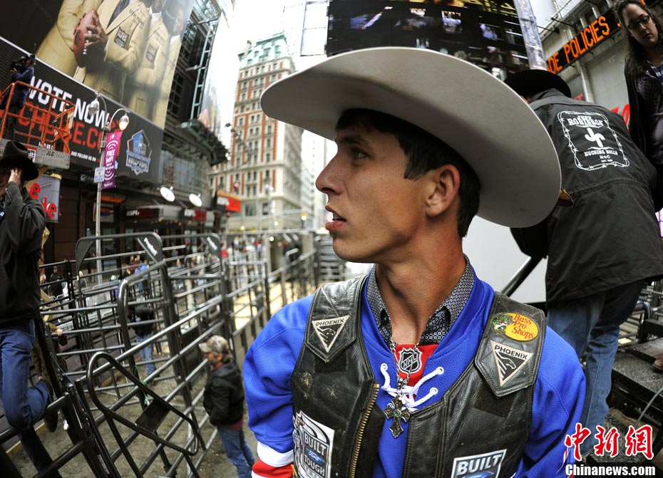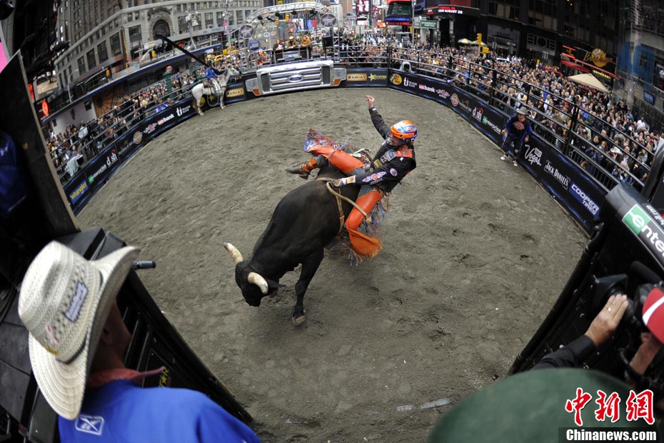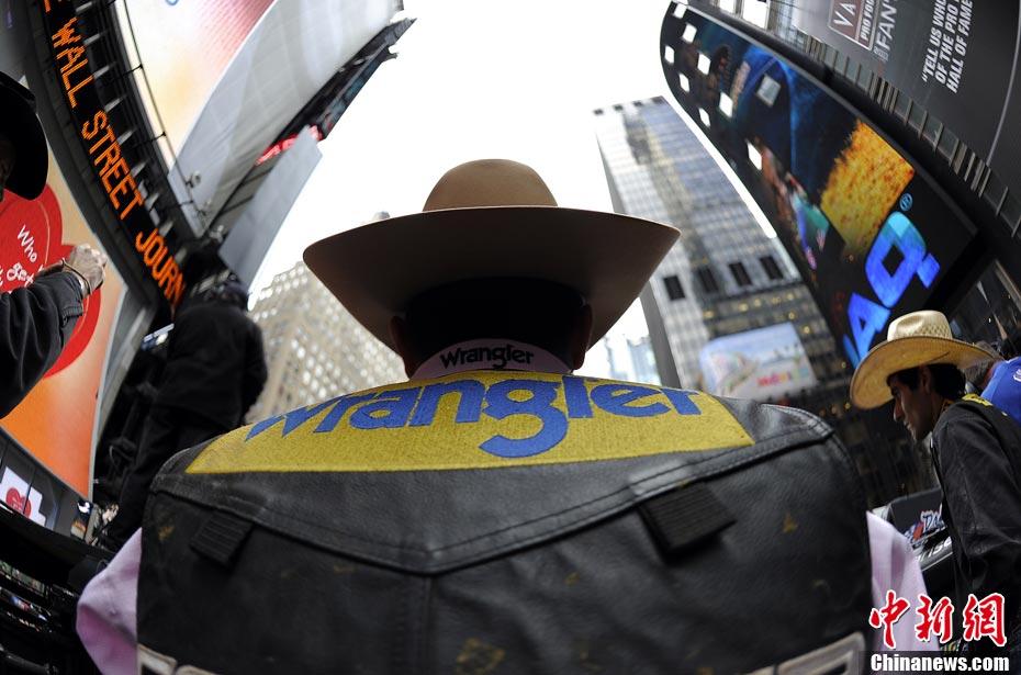 當地時間10月15日,10名美國職業騎牛大賽的頂尖選手在紐約時報廣場上演了一場精彩的騎牛大賽,為將于10月20日至24日在美國拉斯維加斯舉行的2010職業騎?倹Q賽造勢。