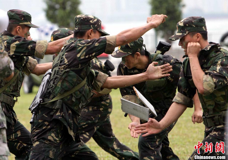 10月16日,中國人民解放軍駐港部隊(duì)特種兵在香港昂船洲海軍基地進(jìn)行“獵人戰(zhàn)斗”演練,展示過硬的搏擊功夫。當(dāng)天,駐軍與香港各大院校大學(xué)生聯(lián)誼活動(dòng),以各種形式相互交流,增進(jìn)香港學(xué)生對國家的了解。 中新社發(fā) 洪少葵 攝