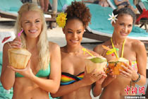 10月22日,海南三亞,第60屆世界小姐總決賽當天上午舉行運動小姐評比。120余位佳麗在被譽為“天下第一灣”的三亞亞龍灣上演了一場“最美運動會”。經過賽跑、沙灘跳遠、游泳三個項目的比拼,20歲的北愛爾蘭小姐Lori MOORE (中)獲得“運動小姐”桂冠,斯洛伐克小姐Marina GEORGIEVOVA (右)和挪威小姐 Mariann BIRKEDAL(左)分獲二三名。 第60屆世界小姐總決賽晚會將于10月30日舉行。中新社記者 尹海明 攝